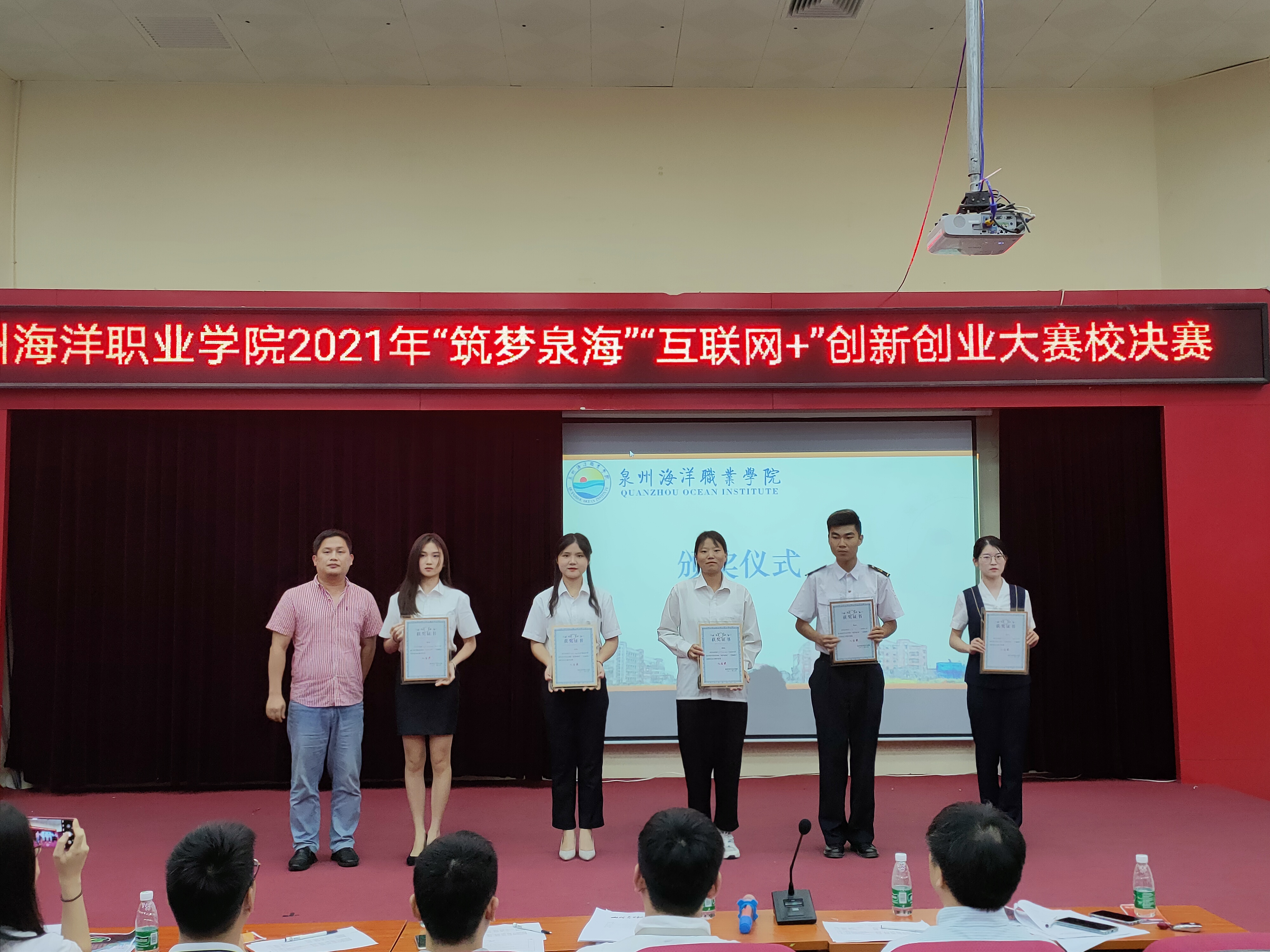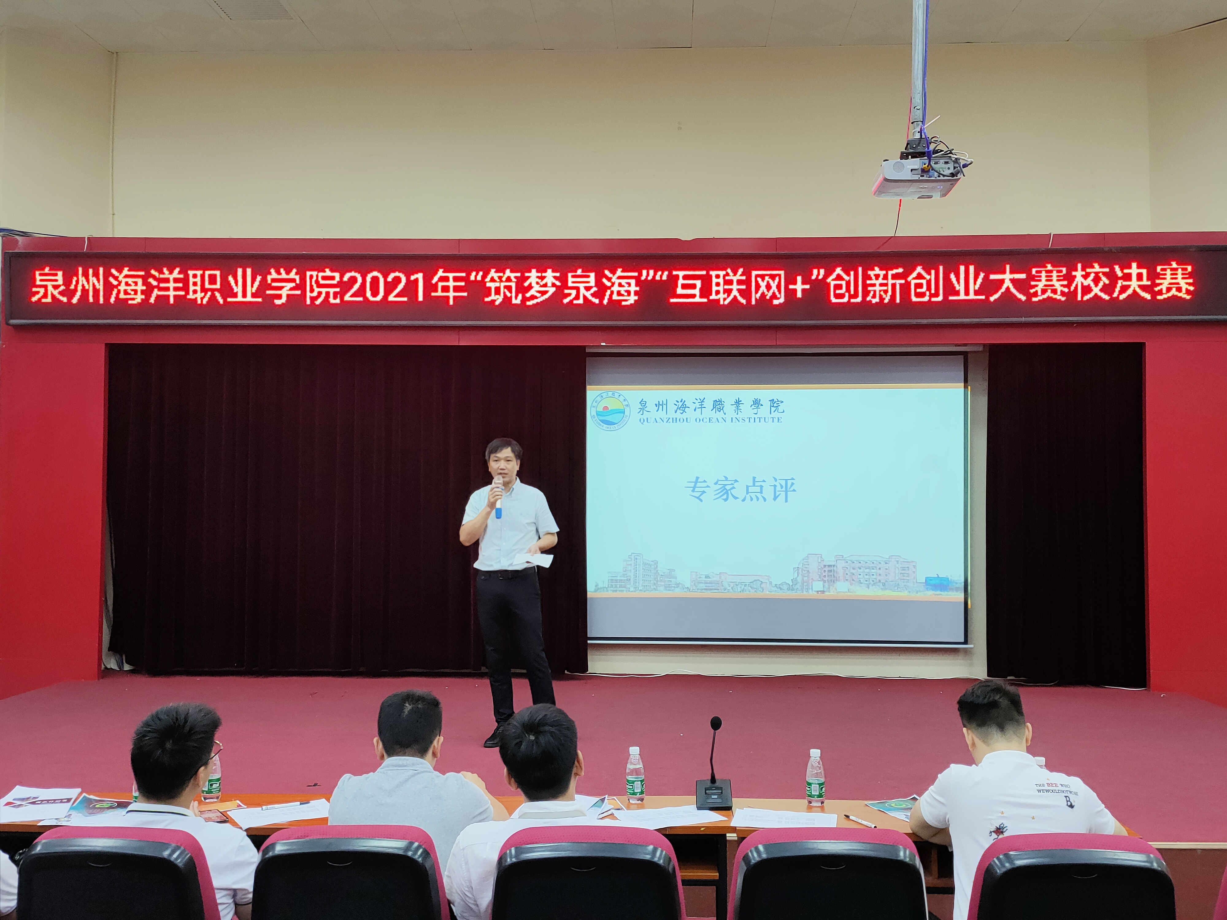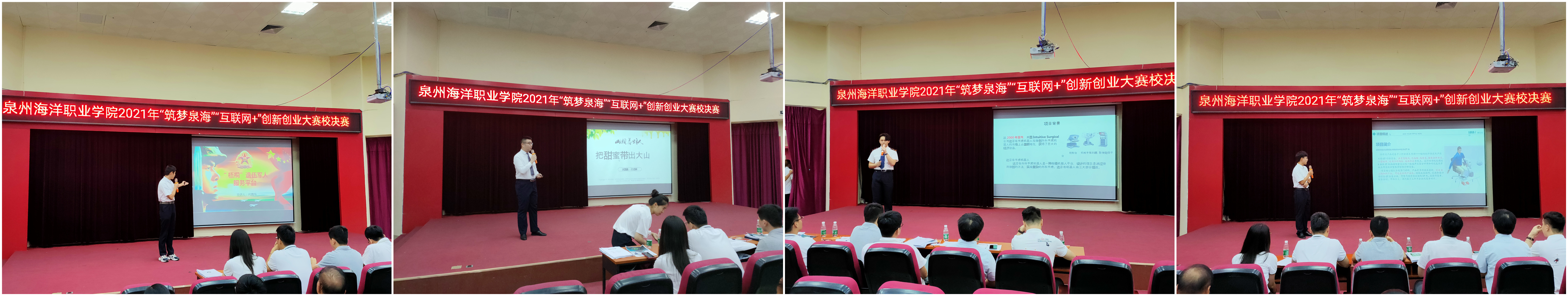 新闻中心讯(校团委陈智伟 陈娇 党委宣传部报道)2021年6月29日,我校2021年“筑梦泉海”“互联网+”创新创业大赛校决赛在2204报告厅内举行。我校副校长陈永鑫,向日葵教育集团总经理兼国赛集训营专家吴秀春、厦门泛海国际船舶管理有限公司高级主管陈宾鸿、福建锦壹位科技有限公司总经理夏东东、如是集团人事总监兼泉州人力资源管理师协会理事长陈斯超出席本次决赛。各学院书记、团委负责人、辅导员及学生代表参与本次活动。