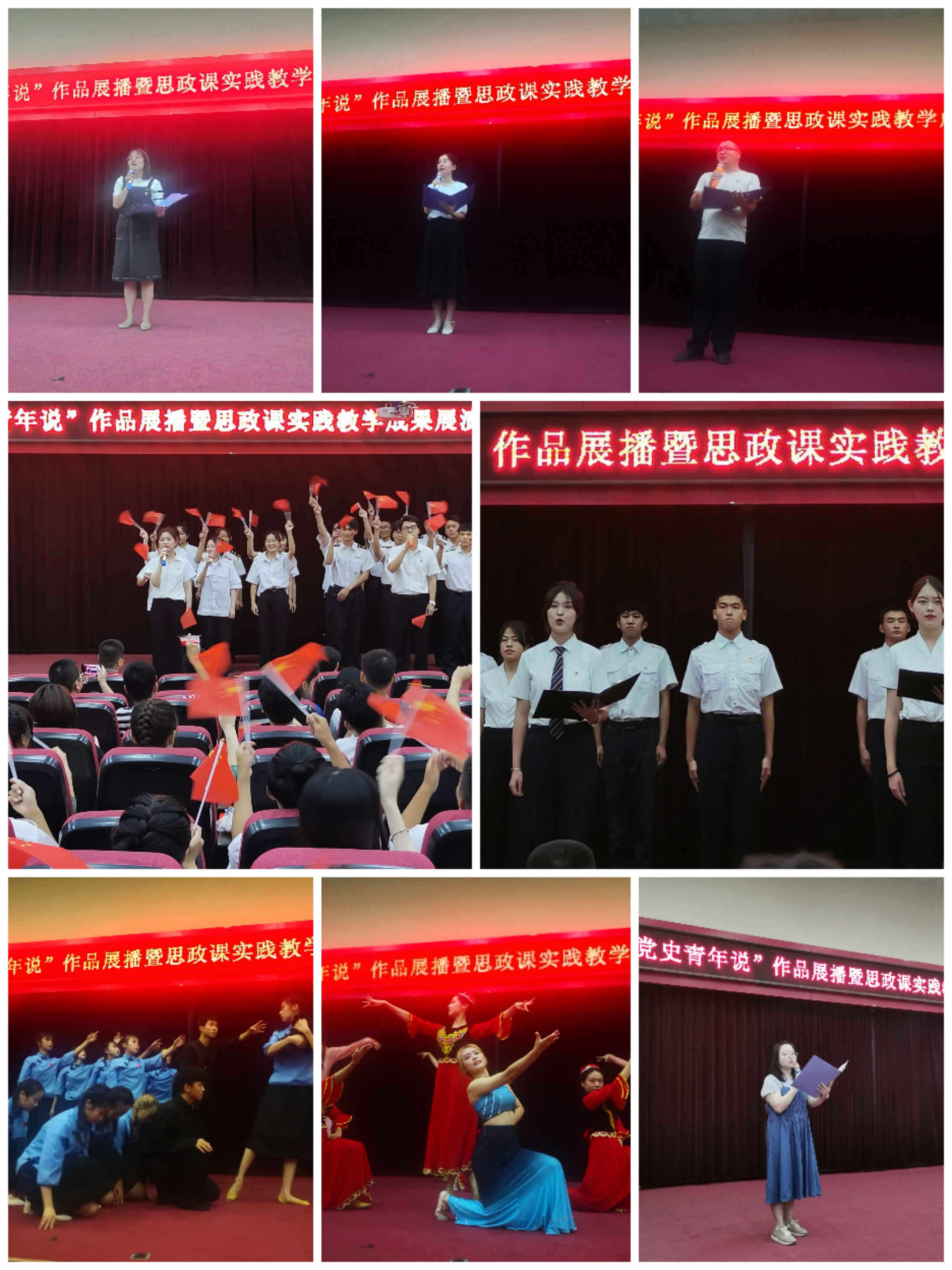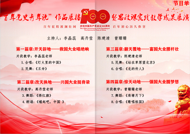 本次思政课实践教学成果展演活动以百年党史为主线,分为四个篇章“开天辟地:救国大业唱绝响”“改天换地:兴国大业挺脊梁”“翻天覆地:富国大业腰杆壮”“惊天动地:强国大业圆梦想”四个篇章,分别由马院李晶蕊、高丹莹、陈建清、曾珊珊四位老师主讲,并通过集体朗诵、情景剧、舞蹈、合唱等形式,展现在中国共产党领导下,中华民族实现民族独立、人民解放、繁荣富强和迈向民族复兴的动人征程。最后,展演活动在全场师生齐唱《歌唱祖国》的赞歌声中顺利落下帷幕。