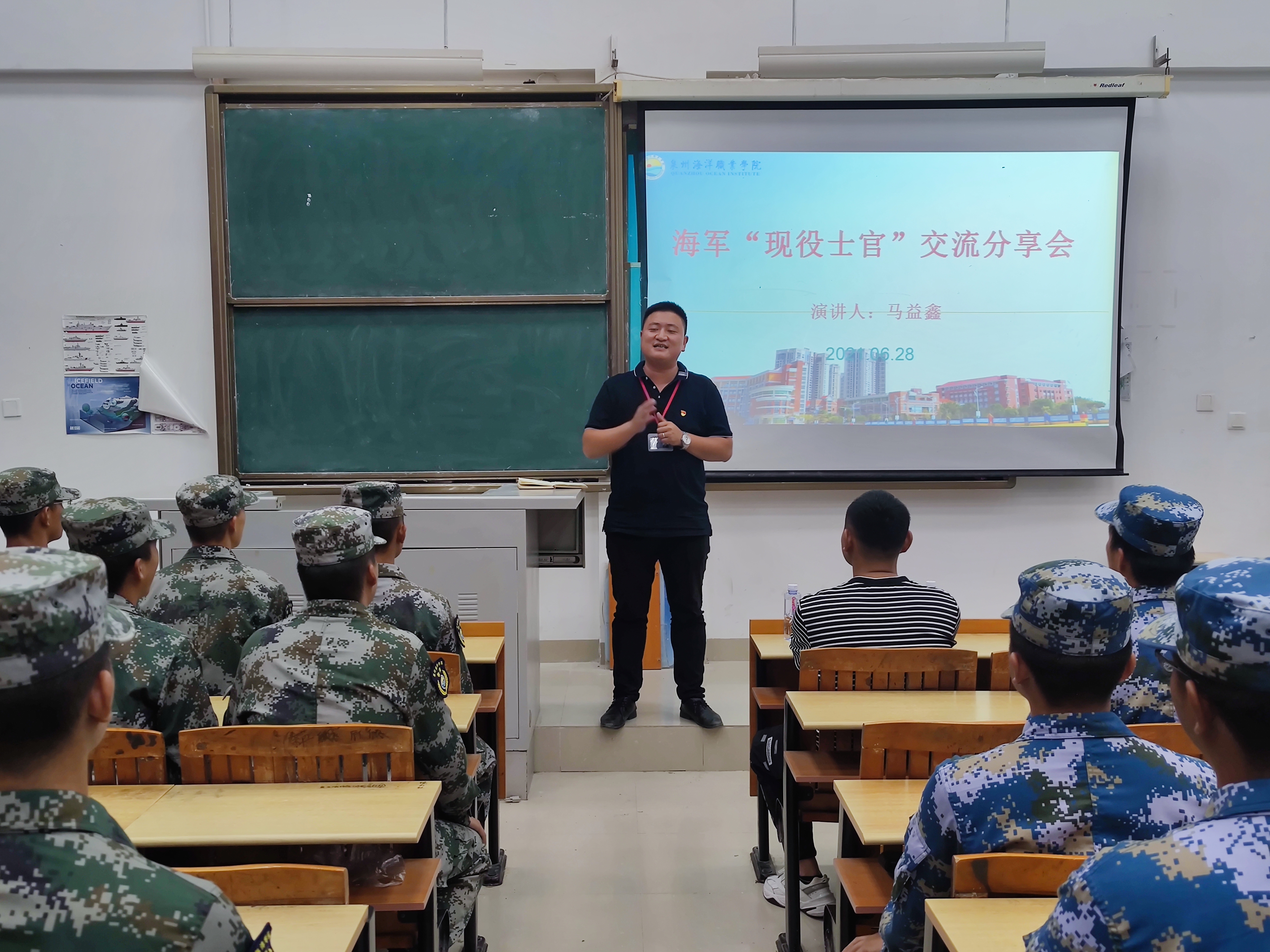 新闻中心讯(国防教育基地吴东洋供稿 党委宣传部报道)为进一步加强学生对海军部队和直招士官、征兵政策的了解,2021年6月28日,我校召开了海军“现役士官”交流分享会。本次交流会特邀我校16届优秀毕业生、海军某舰艇部队“二期士官”马益鑫出席,与“国防后备班”的同学们进行经验分享。副校长陈永鑫、校长助理兼武装部部长苏良城出席本次活动,国防教育基地书记李艺鹏、国防教育基地相关教职人员及全体学生共同参加。交流分享会由国防教育基地书记李艺鹏主持。