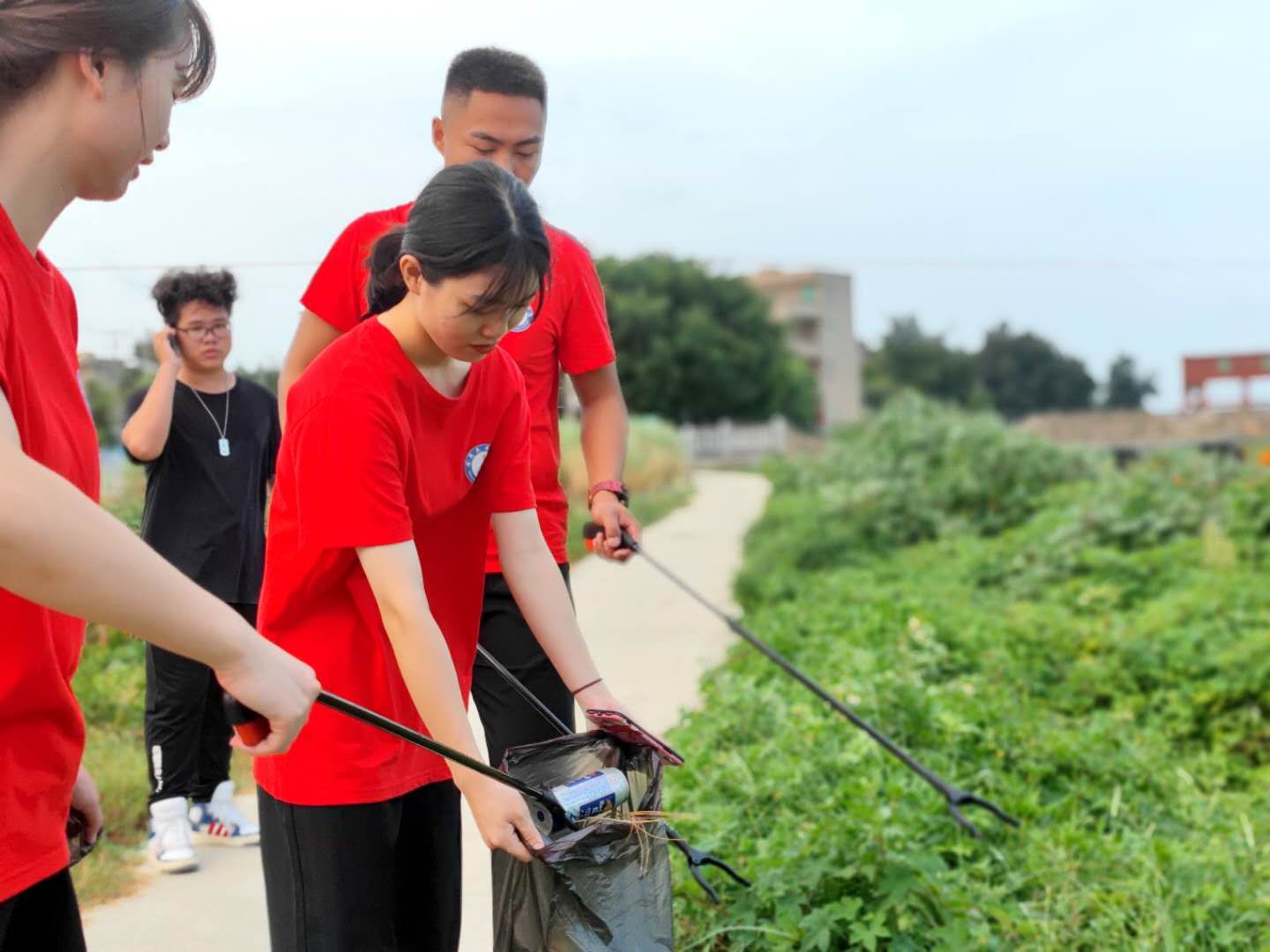 (图为青年志愿者清理河道旁垃圾)
