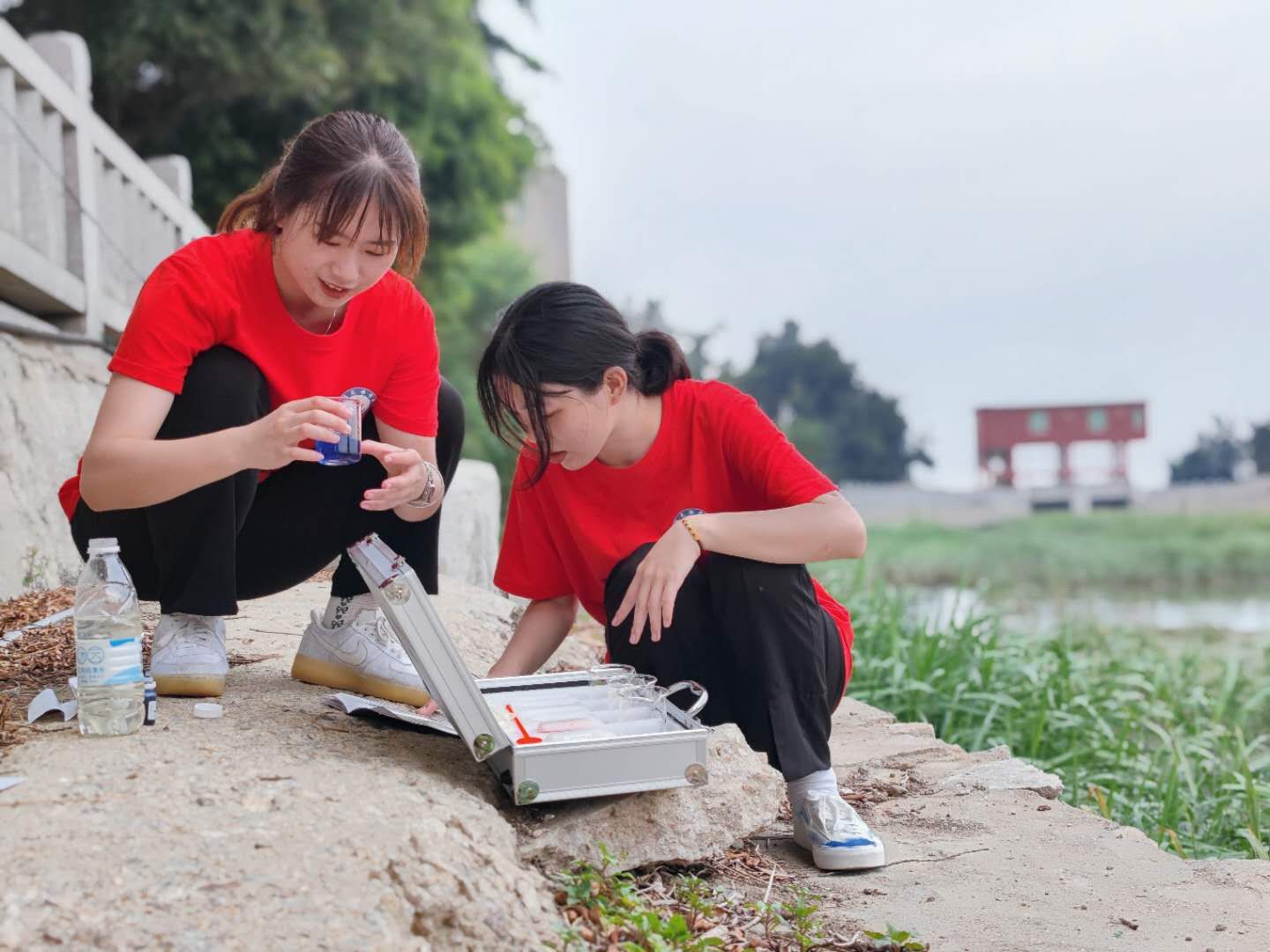 (图为青年志愿者进行水质检测)