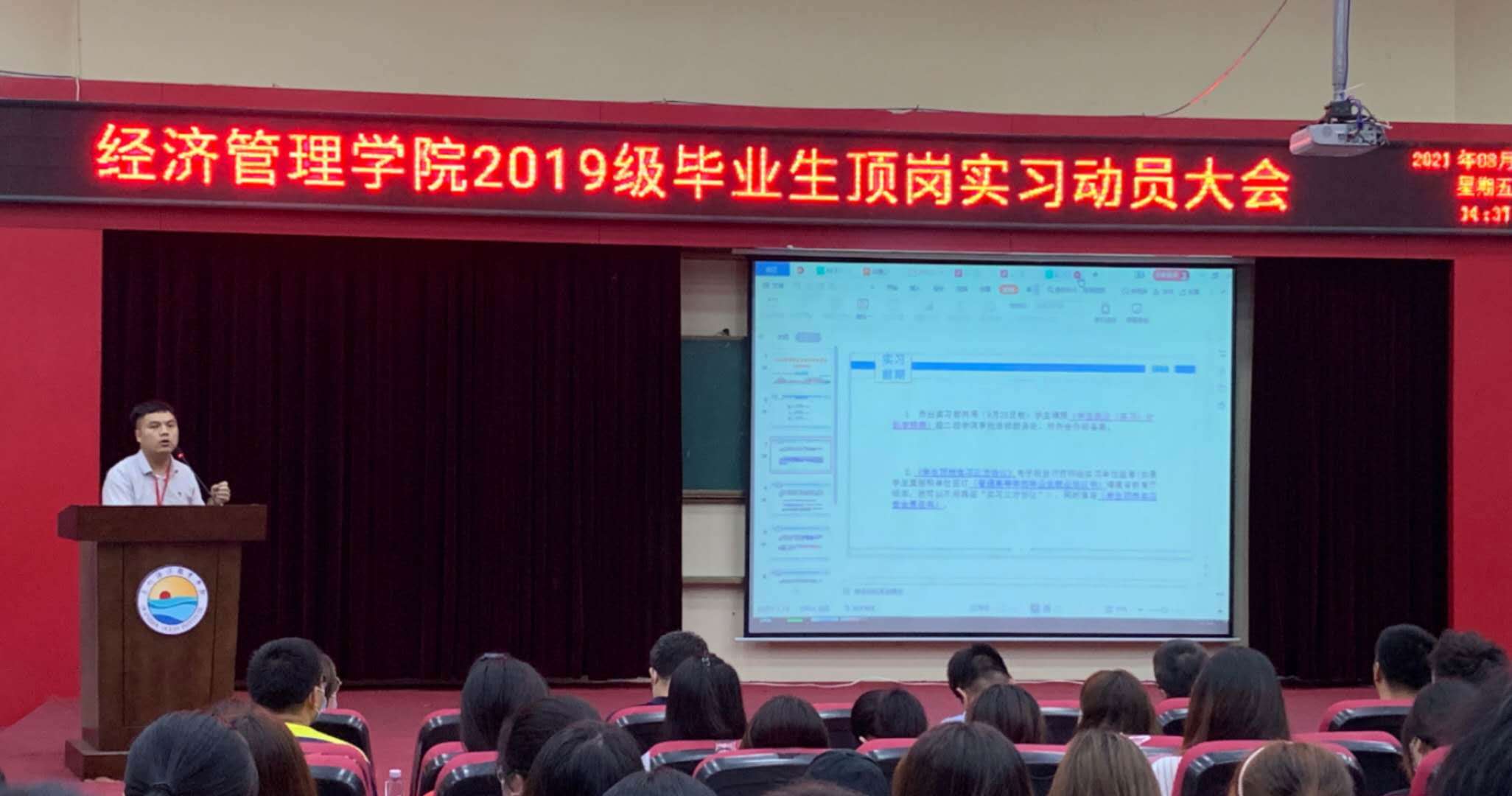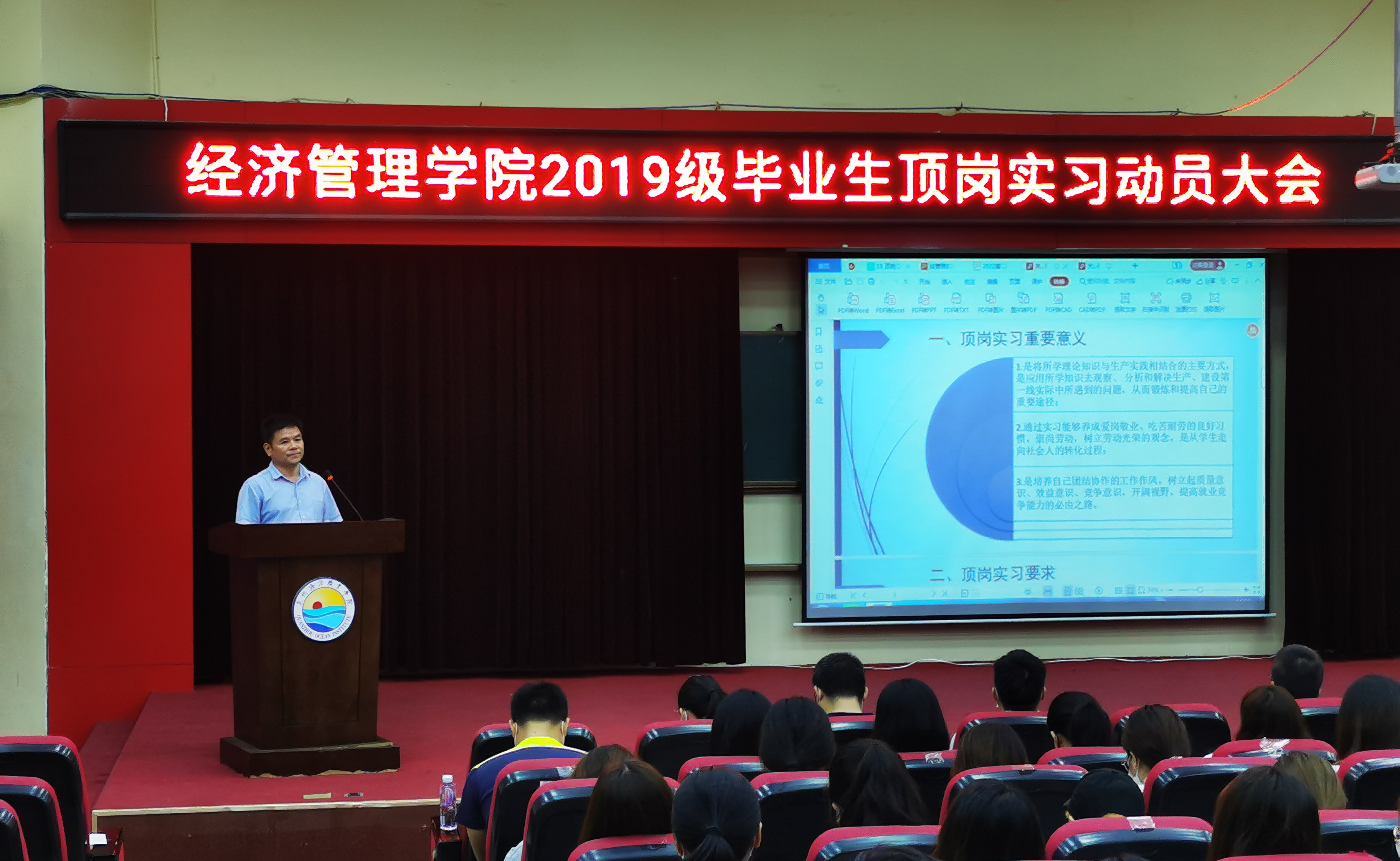 新闻中心讯(经济管理学院徐雪婷供稿 党委宣传部报道)8月6日,经济管理学院于2204报告厅召开2019级学生顶岗实习动员大会。副校长兼经济管理学院院长杨雄教授、多维创业创始人陈奇波先生及学院领导、全体专任教师、辅导员及2019级毕业生参加了此次大会。本次大会由院学生会主席吴晓艳主持。