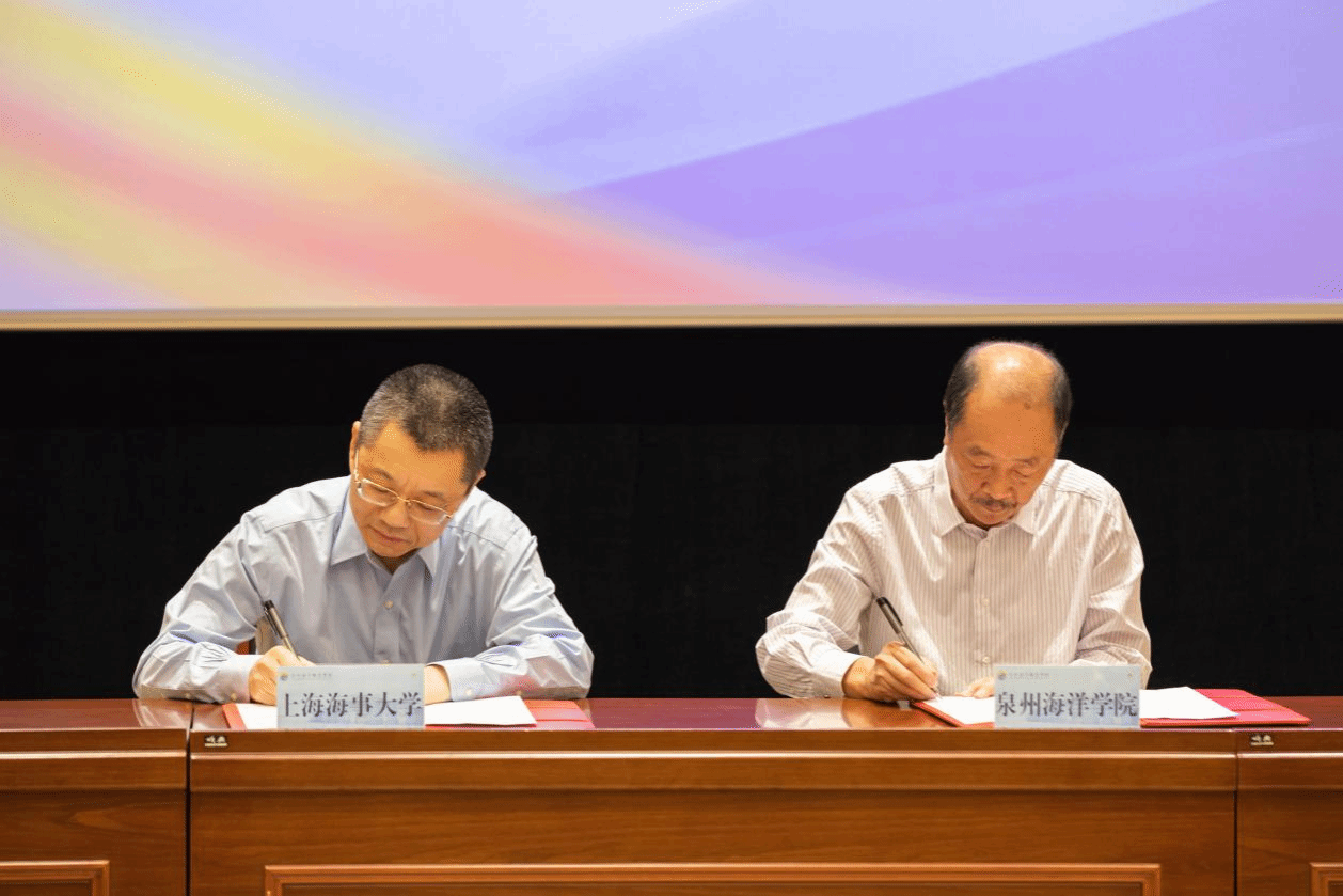 在全体与会人员的共同见证下,我校董事长蔡天真先生与上海海事大学校长陆靖教授携手上台,共同签署泉州海洋职业学院与上海海事大学战略合作协议。仪式上双方还签署了学校基金会向上海海事大学捐赠协议。