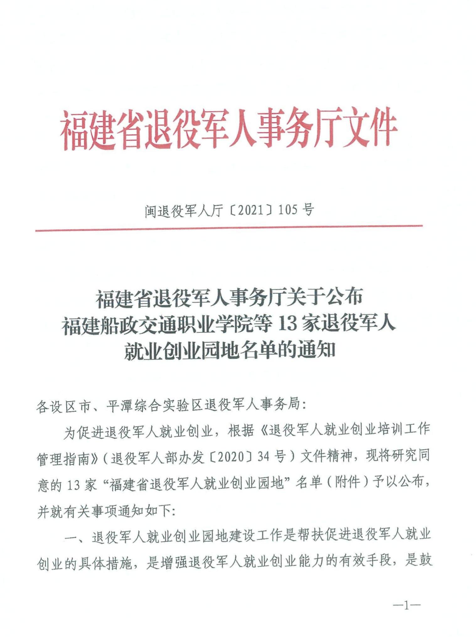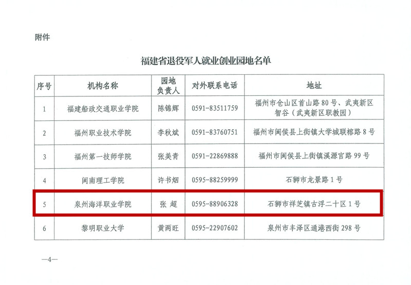 新闻中心讯(党委宣传部报道)近日,福建省退役军人事务厅公布福建省市退役军人就业创业园地名单,我校榜上有名。我校一直以来致力于开展退役军人就业创业技能培训工作,帮助退役军人迈好工作转轨、事业转型、人生转段的关键一步。目前已成功打造商业类、军魂事业类、普通服务类三大特色创业园区。