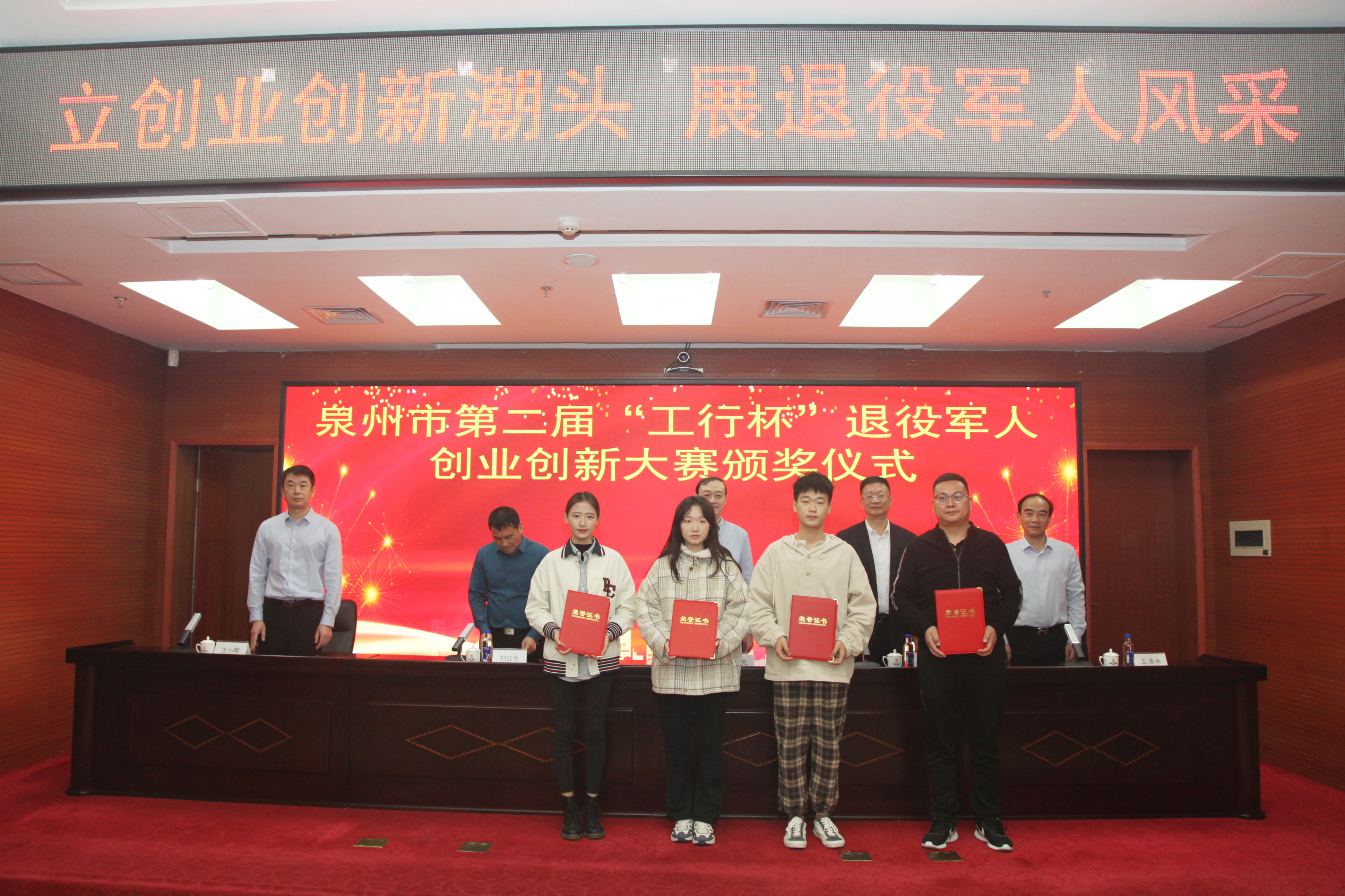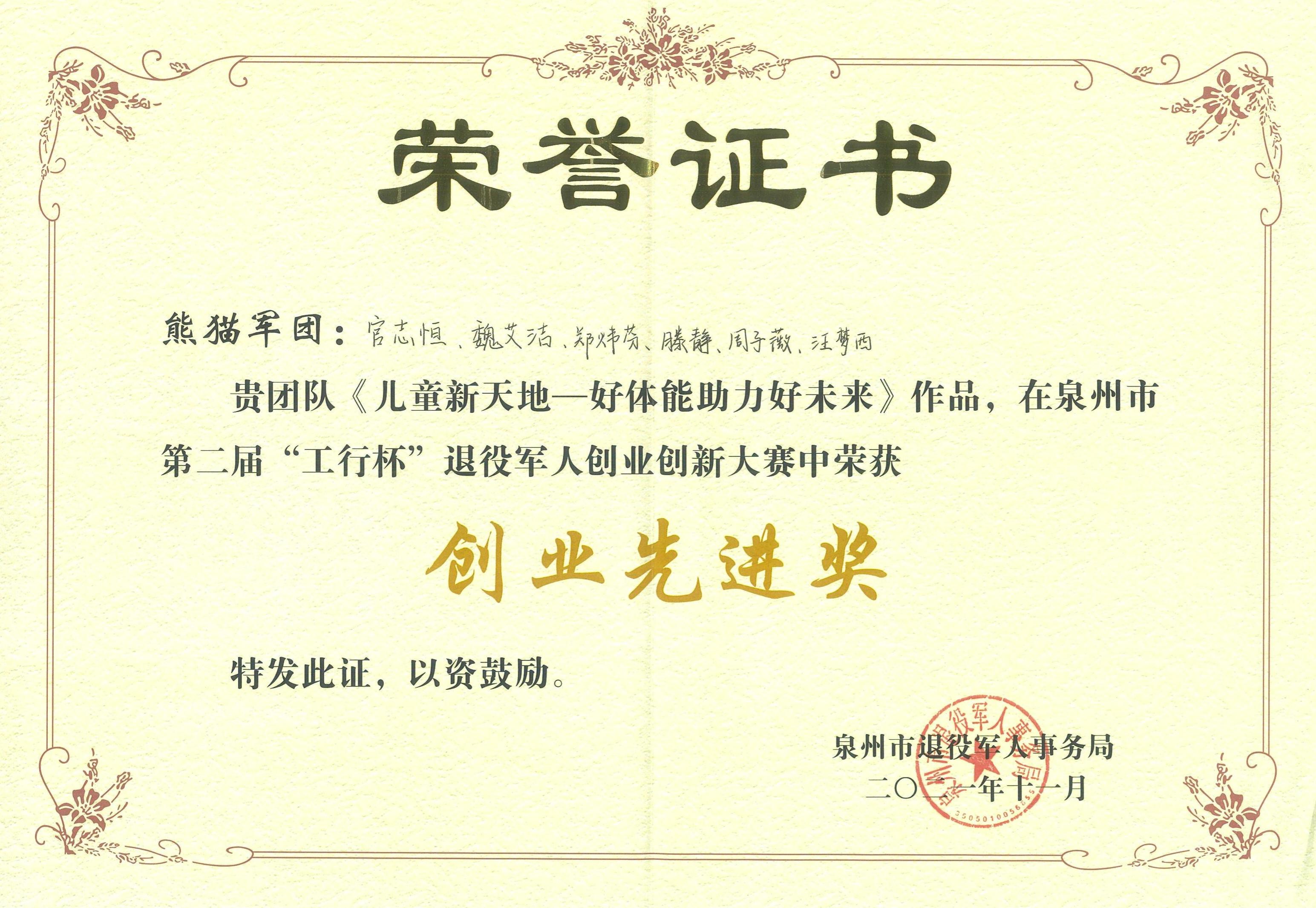 新闻中心讯(对外合作部郑天明供稿 党委宣传部报道)日前,泉州市第二届“工行杯”退役军人创业创新大赛成绩揭晓。据悉,本次赛事面向泉州市所有退役军人。赛事开始后,各县(区)退役军人事务局积极开展组织参赛,经组织专家评审、社会公示后,最终14项创业创新项目获得市级奖项。其中,我校项目《儿童新天地--好体能助力好未来》(团队:官志恒 魏艾洁 郑炜芬 滕静 周子薇 汪梦西)获得泉州市第二届“工行杯”退役军人创业创新大赛创业先进奖。