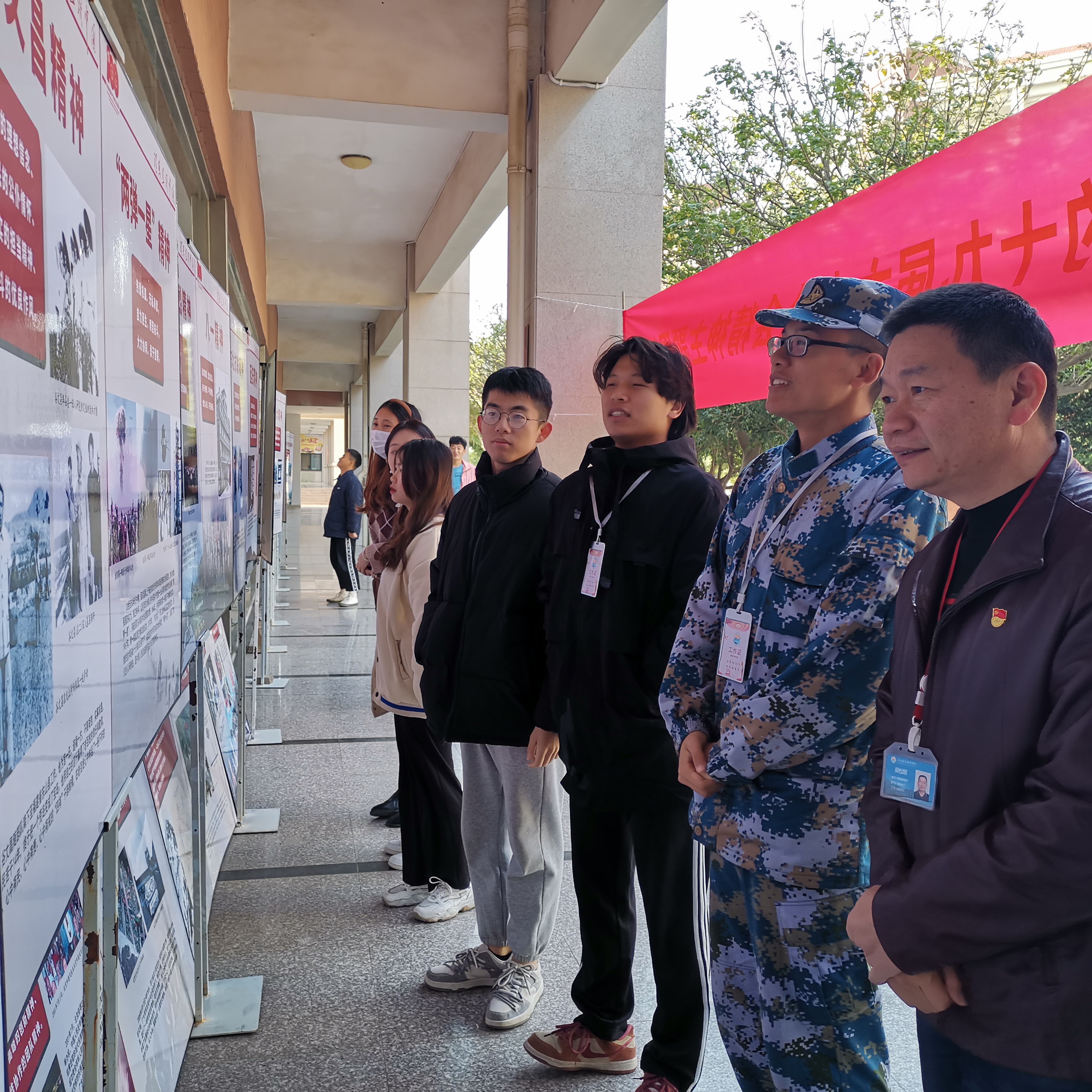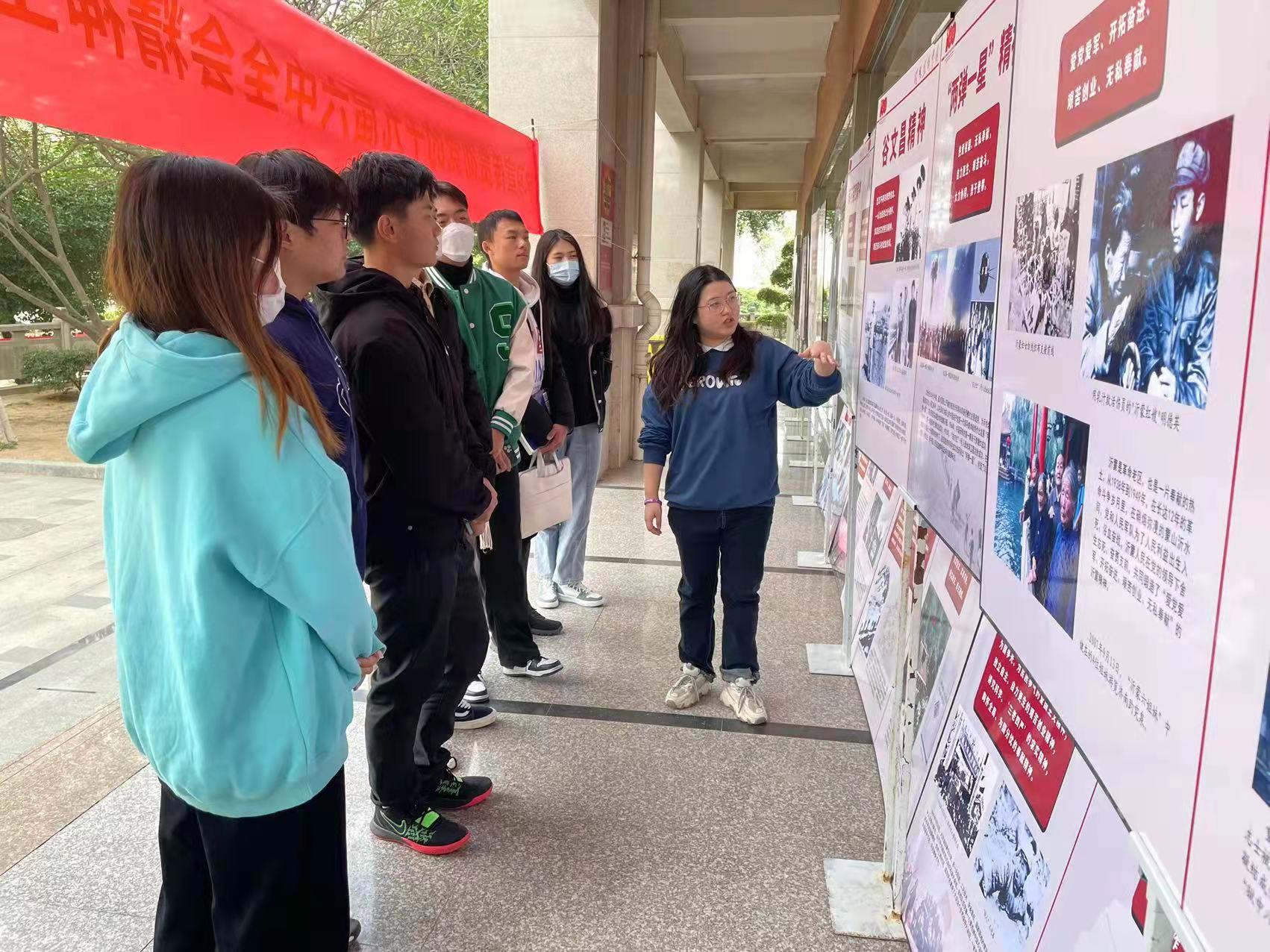 本次图片展展示了学习宣传贯彻党的十九届六中全会精神,加快构建中国特色哲学社会科学的重要观点和重要思想,并重点展示了以红船精神、井冈山精神、长征精神、遵义会议精神、古田会议精神、延安精神、抗战精神、西柏坡精神等为代表的革命精神,以抗美援朝精神、大庆精神、雷锋精神、焦裕禄精神、“两弹一星”精神等为代表的艰苦创业精神,以特区精神、女排精神、九八抗洪精神、载人航天精神、抗震救灾精神等为代表的改革开放精神,以伟大抗疫精神、伟大脱贫攻坚精神等为代表的新时代伟大奋斗精神等中国共产党的精神谱系。用图文并茂的方式,带领师生深刻感悟党的百年奋斗征程,大学生党建助理团成员现场同步开展讲解工作。