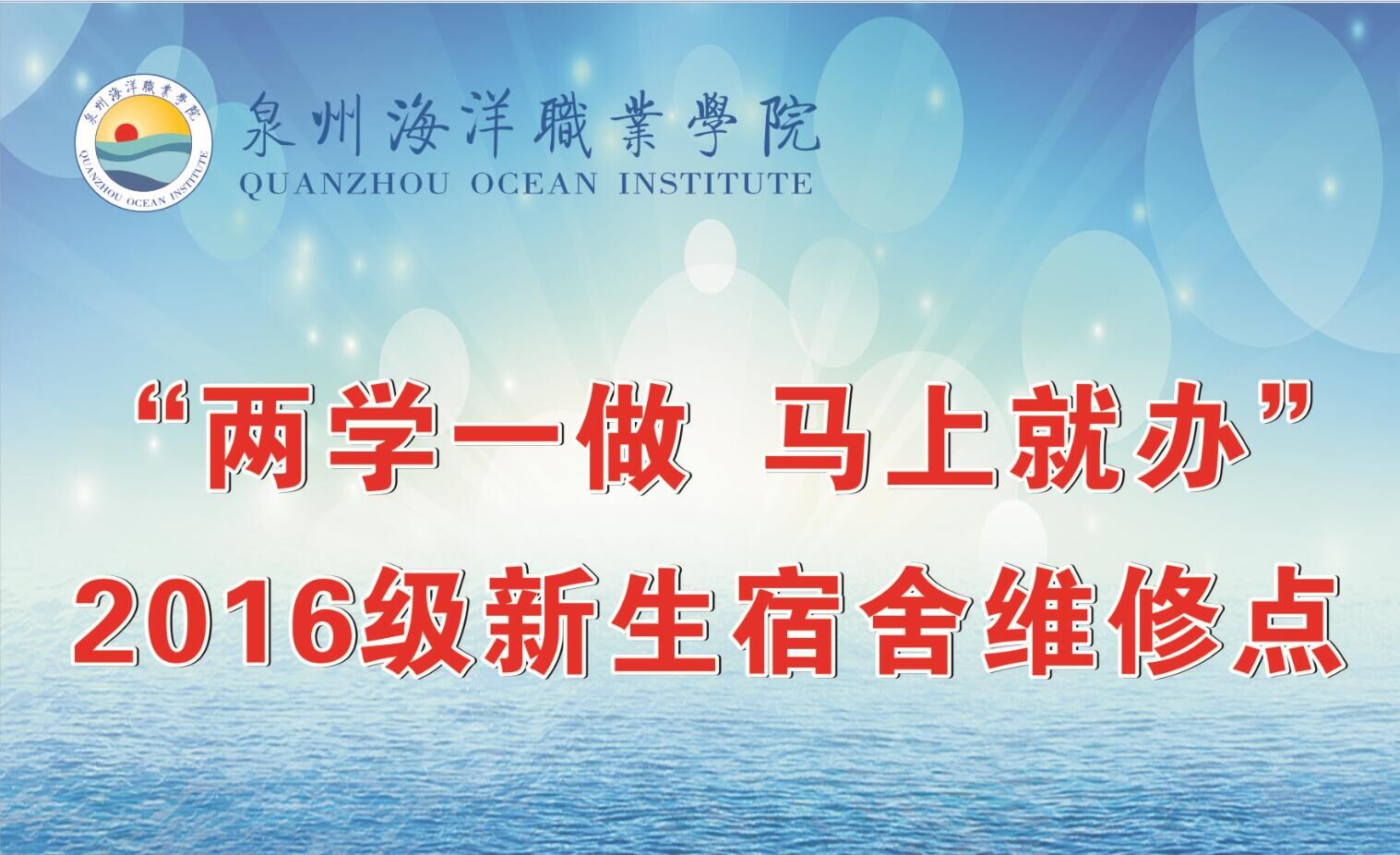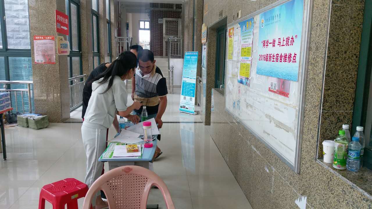 9月3日新生报道日开始,后勤处联合学生第三党支部在各宿舍楼设立“两学一做,马上就办”宿舍维修点,从上午八时至下午十时,现场为新生提供受理维修项目的登记,并立即依序安排木工、水电工进行维修,提高报修效率,及时有效地解决了宿舍修缮问题。