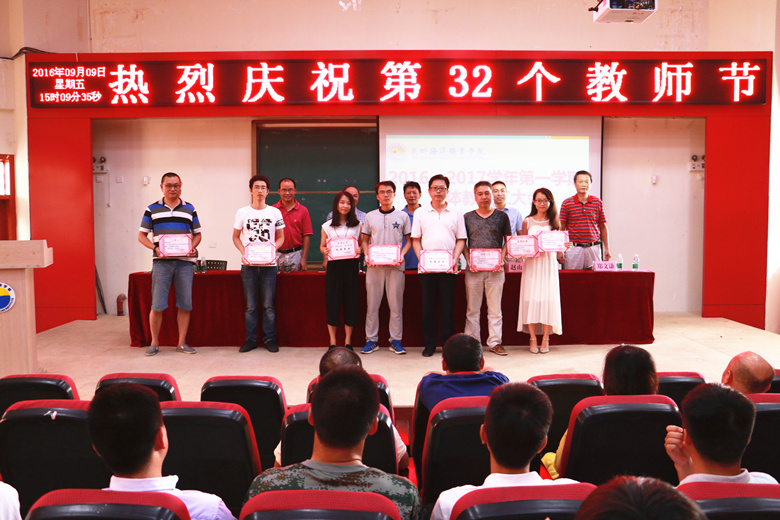 院长助理林金良研究员代表学院宣读“关于表彰2015-2016学年‘优秀教师’、‘先进教育工作者’、‘先进集体’的决定”等表彰文件。党政办、教务处等部门获得年度先进集体荣誉称号,黄演卿等12名老师获得年度优秀教师荣誉称号,李志等6名老师获得年度先进教育工作者荣誉称号。大会还对上一学期参加教师教学能力竞赛的获奖教师进行了表彰,轮机系吴丽娇老师获得一等奖,基础部王志华、人文系陈丽娜等老师获得二等奖,航海系杨新彪、人文系赵静、刘轹厉等老师获得三等奖。受表彰的集体和个人分批上台接受嘉奖。