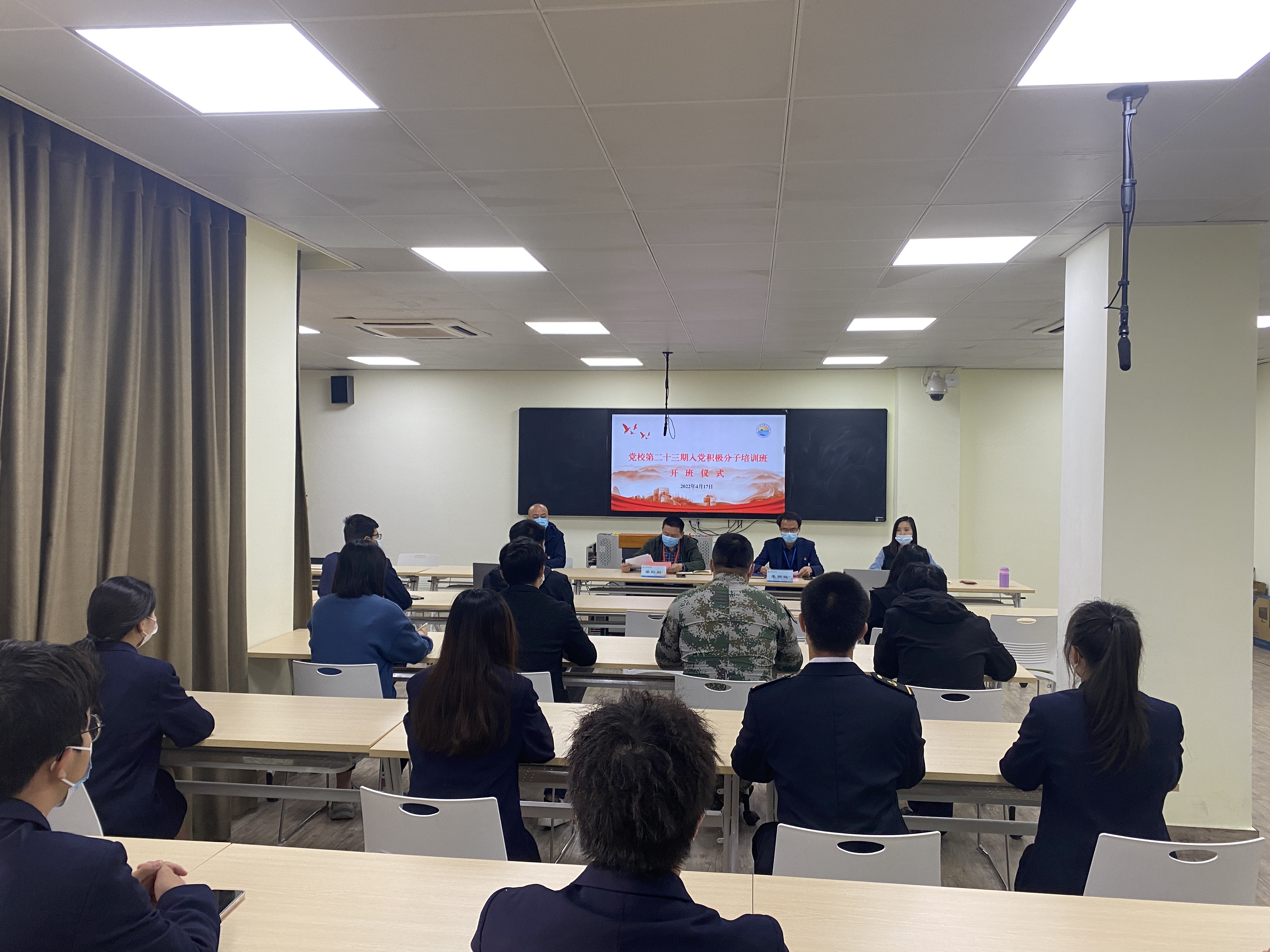 新闻中心讯(党建助理团 李楠茜供稿 党委宣传部报道)2022年4月17日,泉州海洋职业学院党校第二十三期入党积极分子培训班开班仪式在智慧教室举行。为落实上级关于疫情期间不举办规模聚集活动的要求,本次开班仪式采用线上+线下相结合的方式进行。校党委书记梁松刚、校党委副书记兼党校校长李明灿到场出席仪式,党委组织委员李艺鹏、各基层党组织副书记及学员代表参加现场仪式,300余名学员聚首云端参加会议。党政办公室副主任黄玲玲主持仪式。
