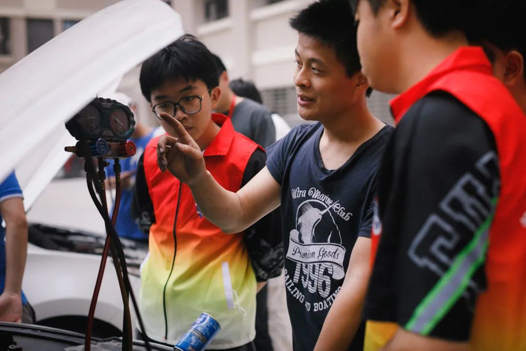 同学们首先对车辆内部进行封膜保护,防止在养护过程中对车辆造成污染。随后,对车辆机油余量和气缸压力进行了检测,确保一切正常。在空调清洗完成后还对车辆玻璃水余量进行了检查并添加。一系列流程化的操作体现出了海洋工程学院师生的较强的专业水准。