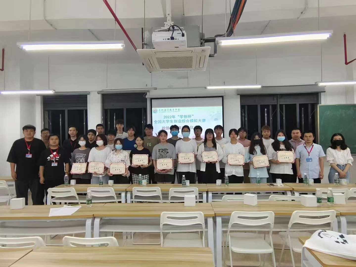 新闻中心讯(对外合作部 胡晓霞报道 党委宣传部供稿)5月23日,由对外合作部主办的2022年“学创杯”全国大学生创业综合模拟大赛校级选拔赛在图书馆大楼504教室举行。航海交通学院副书记董灿荣、经济管理学院副书记陈合喜、新能源创客科技院长陈振浩、对外合作部余嘉福老师及相关指导老师参加颁奖仪式。
