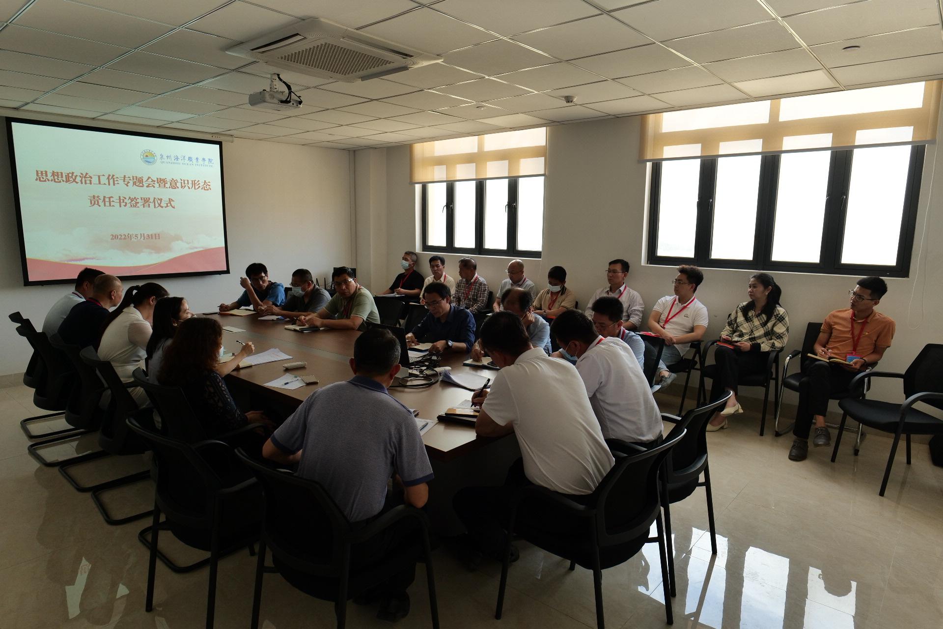 新闻中心讯(党委办公室 黄玲玲供稿 党委宣传部报道)2022年5月31日,我校在图书馆楼7楼会议室举行意识形态工作研判会暨意识形态责任书签订仪式。校党委书记梁松刚、校长朱国辉,全体在家校领导、党委委员出席会议,各基层党组织书记、各行政处(室)及二级学院负责人参加会议。