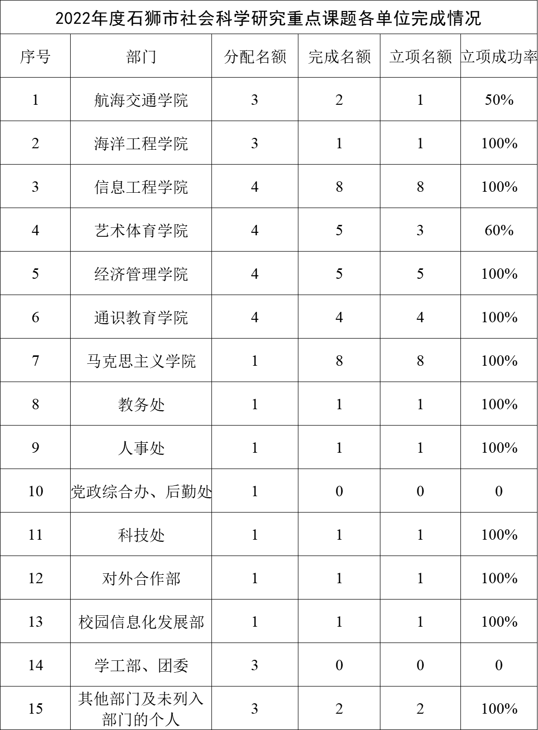 新闻中心讯(科技处 魏昱晴供稿 党委宣传部报道)近日,石狮市社科联公布了《关于2022年哲学社会科学重点课题立项的通知》(狮社联〔2022〕8号),我校共37个课题立项,立项率达到92.5%,创建校以来历史新高!具体各单位申报情况和立项结果如下: