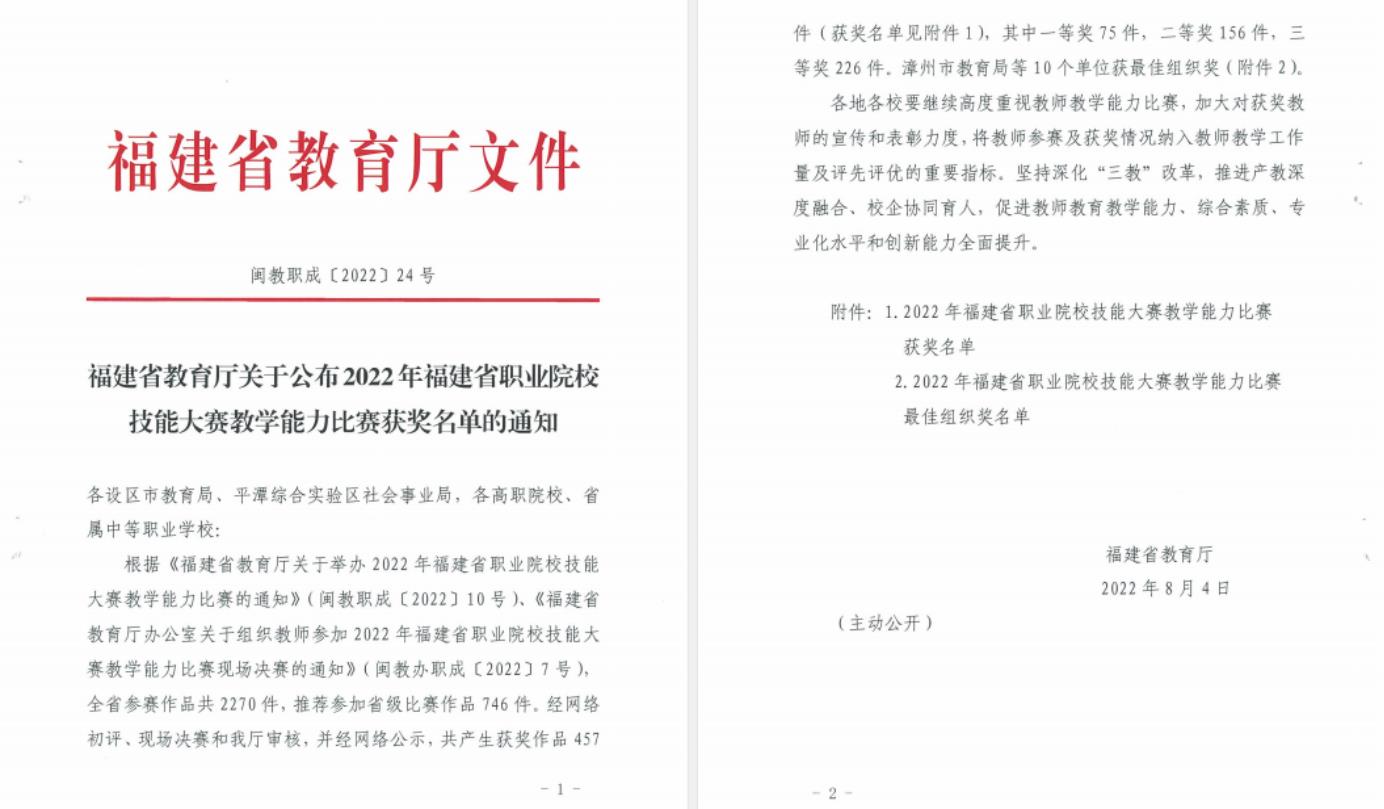(新闻中心讯 教务处邱妮娜供稿 校党委宣传部报道)近日,福建省教育厅下发《福建省教育厅关于公布2022年福建省职业院校技能大赛教学能力比赛获奖名单的通知》(闽教职成〔2022〕24号),我校胡光灼、吴俊伟、张文生、朱帅等教师组成的教学团队,其参赛作品《船舶进港靠泊操作》荣获三等奖。