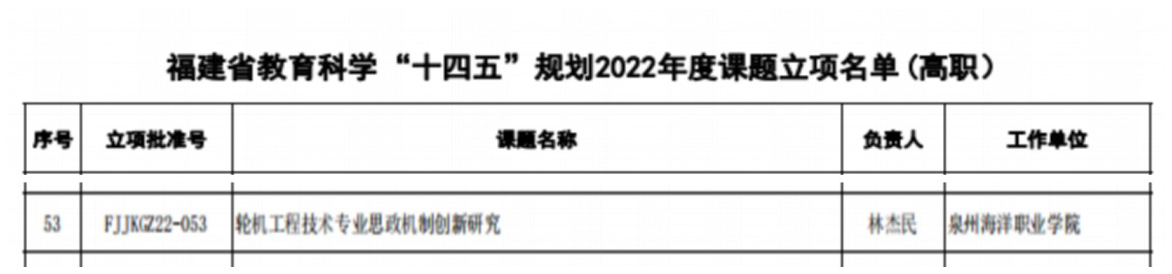 近日,福建省教育科学研究所公布了福建省教育科学“十四五”规划2022年度课题立项结果名单,我校林杰民副院长、副教授主持课题《轮机工程技术专业思政机制创新研究》获批立项;泉州市科学技术局公布了2022年度泉州市科技特派员备案选认结果,经济管理学院黄金帅副院长、副教授、郑天明助理研究员成功选认 2022年度个人科技特派员。