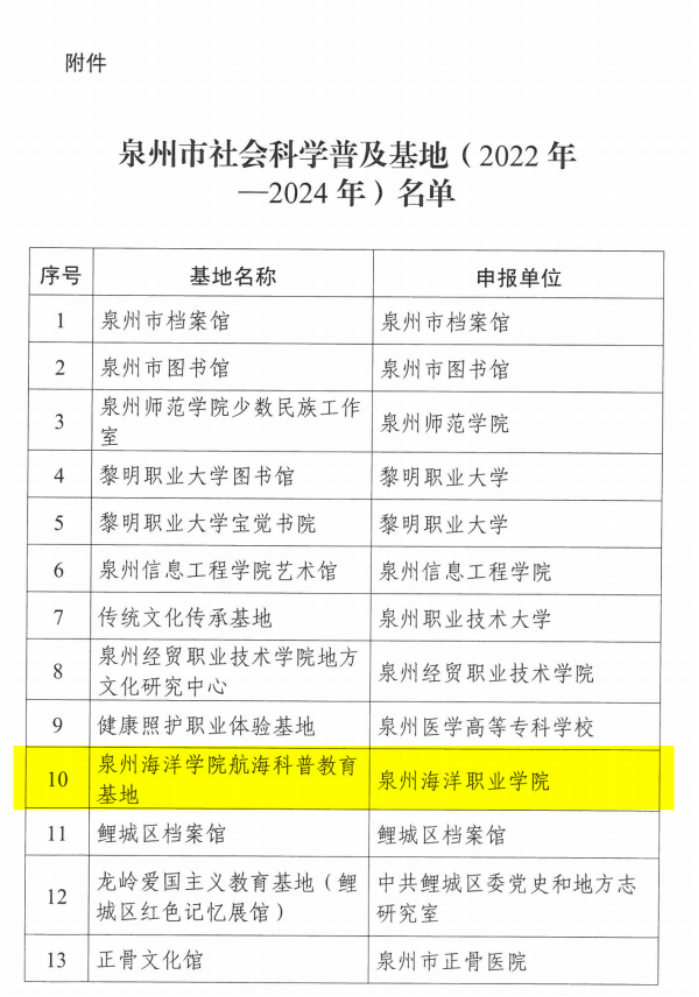 (新闻中心讯 科技处魏昱晴供稿 校党委宣传部报道)近日,中共泉州市委宣传部、泉州市社会科学界联合会发布了《关于命名泉州市社会科学普及基地(2022年— 2024年)的通报》,我校“泉州海洋学院航海科普教育基地”成功被认定为第六届(2022年—2024年)泉州市社会科学普及基地。