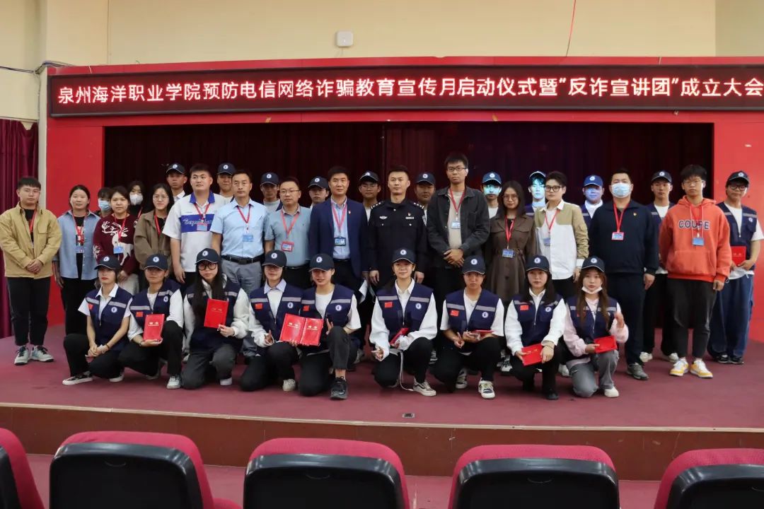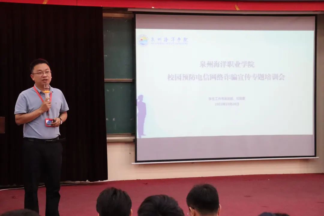 (新闻中心讯 刘志珍供稿 校党委宣传部报道)为提高我校师生的反诈、防骗能力,进一步做好预防电信网络诈骗工作,10月26日,泉州海洋职业学院首届预防电信网络诈骗教育宣传月启动仪式暨“反诈宣讲团”成立大会在2204报告厅举办。祥芝海防派出所警官林鹏辉、学工部部长张君,学工部副部长、校团委书记屈先锋、相关负责老师和学生参加了会议。学工部林淑婷老师主持会议。