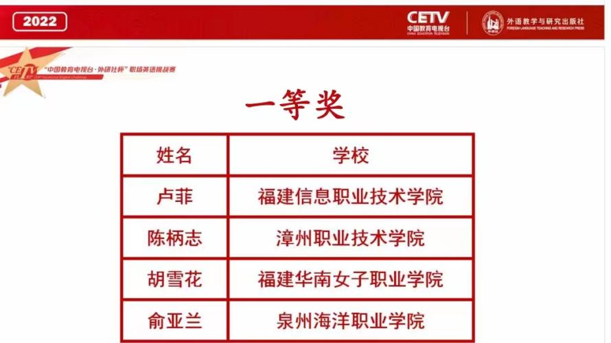 (新闻中心讯 通识教育学院苏婷婷供稿 校党委宣传部报道)近日,由中国职业技术教育学会、中国教育报刊社共同指导,中国教育电视台、外语教学与研究出版社联合主办的2022年“中国教育电视台·外研社杯”职场英语挑战赛落下帷幕。 我校通识教育学院苏婷婷老师带领俞亚兰同学(21级财务管理专业)在全省79名选手中脱颖而出,荣获写作比赛一等奖。黄晓芳老师带领丁悦珥同学(22级影视编导专业),在全省32名选手中脱颖而出,获得演讲比赛三等奖。