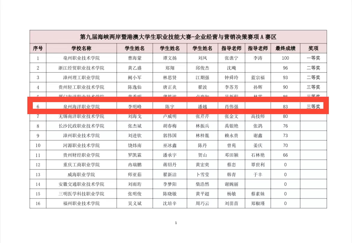 (新闻中心讯 经济管理学院供稿 校党委宣传部报道)由福建省教育厅、福建省人力资源和社会保障厅、福建省互联网信息办公室、平潭综合实验区管委会主办的第九届海峡两岸暨港澳大学生职业技能大赛-企业经营与营销决策竞赛于2022年11月6日落下帷幕。
