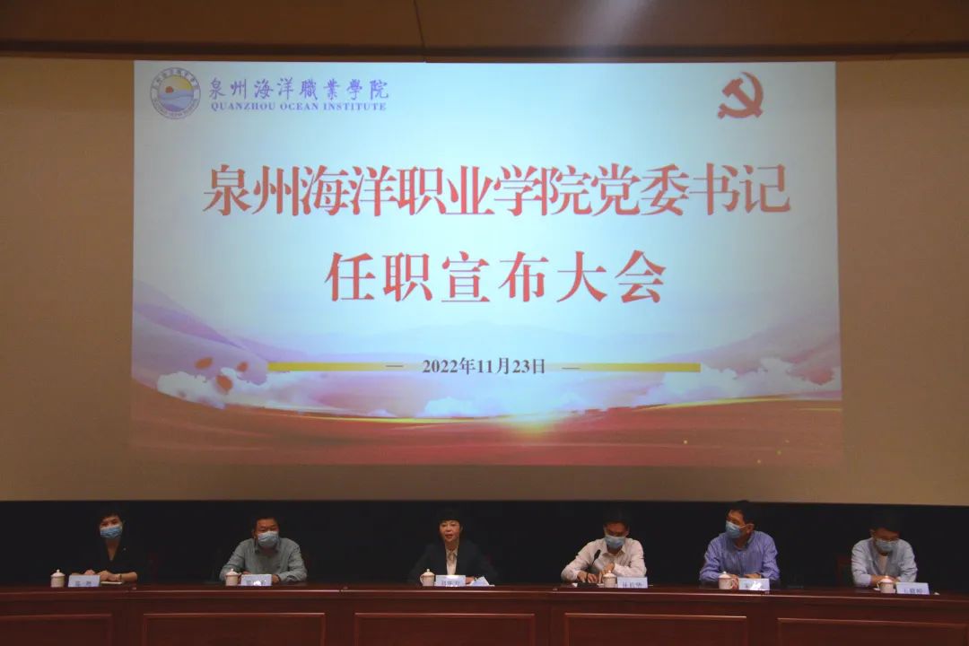 11月23日,学校在校图书馆二楼报告厅召开党委书记任职宣布大会。泉州市委教育工委书记、泉州市教育局局长刘殊芳,泉州市委教育工委委员、泉州市教育局副局长林长华,泉州市教育局组织科科长王毅樟出席会议。学校党政领导班子成员,各行政处室、二级学院负责人,以及群团组织负责人、各党支部班子成员参加会议。会议由林长华副局长主持。