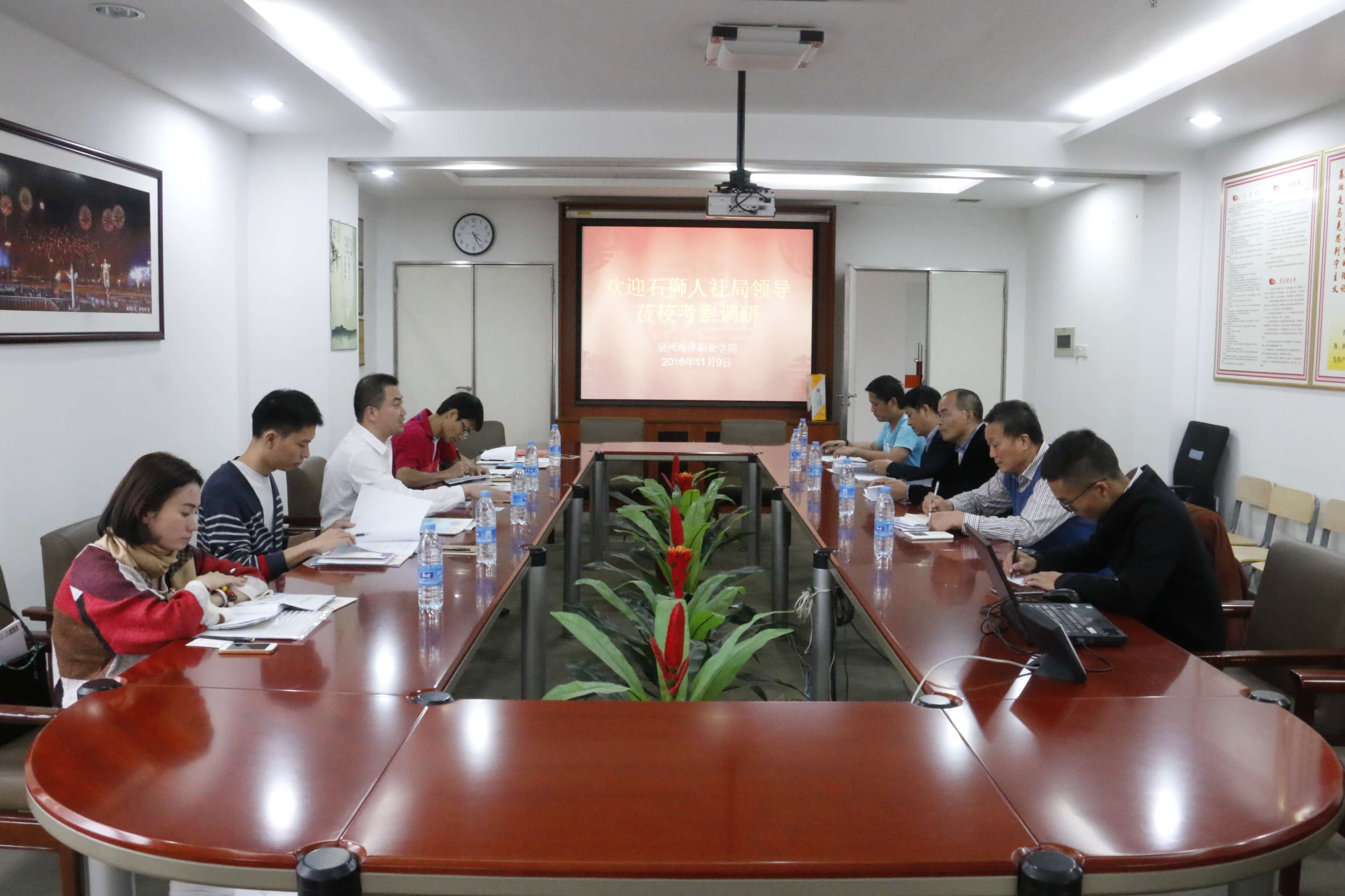 泉州海洋学院新闻中心讯 (党政办 报道) 2016年11月9日下午,石狮市人力资源与社会保障局廖闽欣局长、王翌壮副局长莅临我院,对我院就业创业工作的开展情况进行深入调研。学院党委副书记董清海老师、院长助理郑文谦研究员迅速召集相关部门负责人组成学院就业创业工作汇报小组,接待人社局调研小组一行。