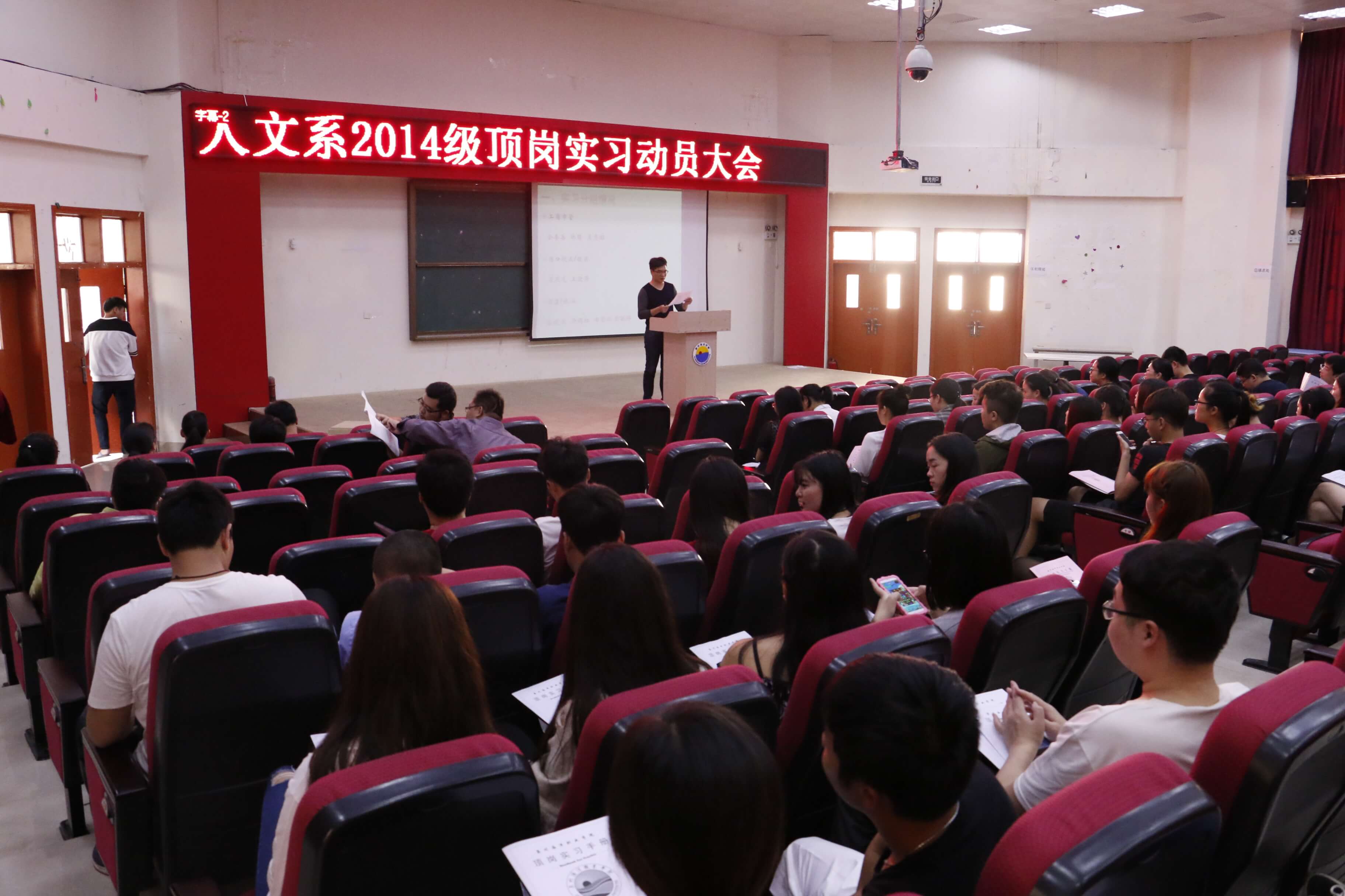 学院新闻中心讯 (人文系 供稿 党政办 编辑 )近日,人文系召集该系全体2014级学生在教学楼2204报告厅召开顶岗实习动员大会,大会由人文系副主任曾庆先老师主持,人文系主要专业教师参加了本次大会。
