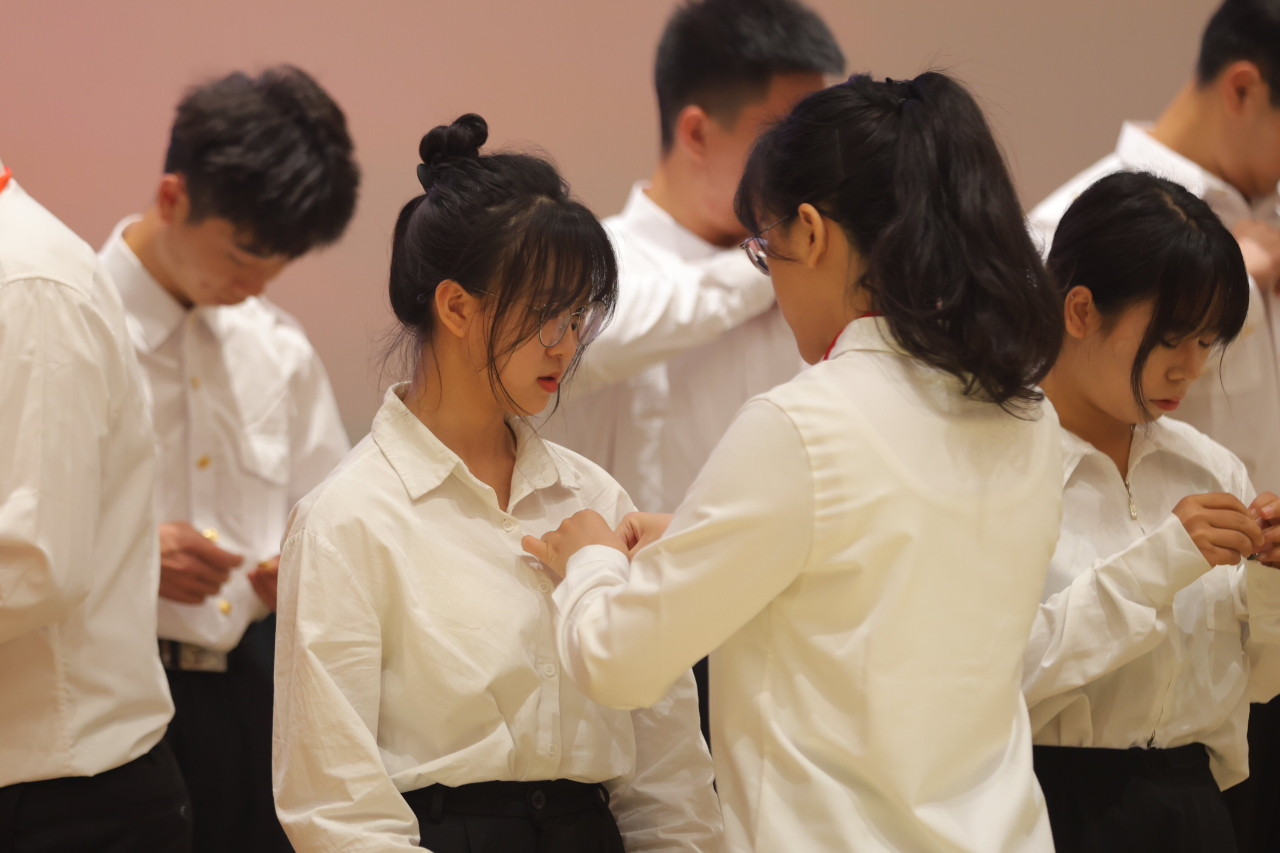 ▲航海交通学院团委书记陈欣欣、经济管理学院团委书记肖伟强为新团员佩戴团徽