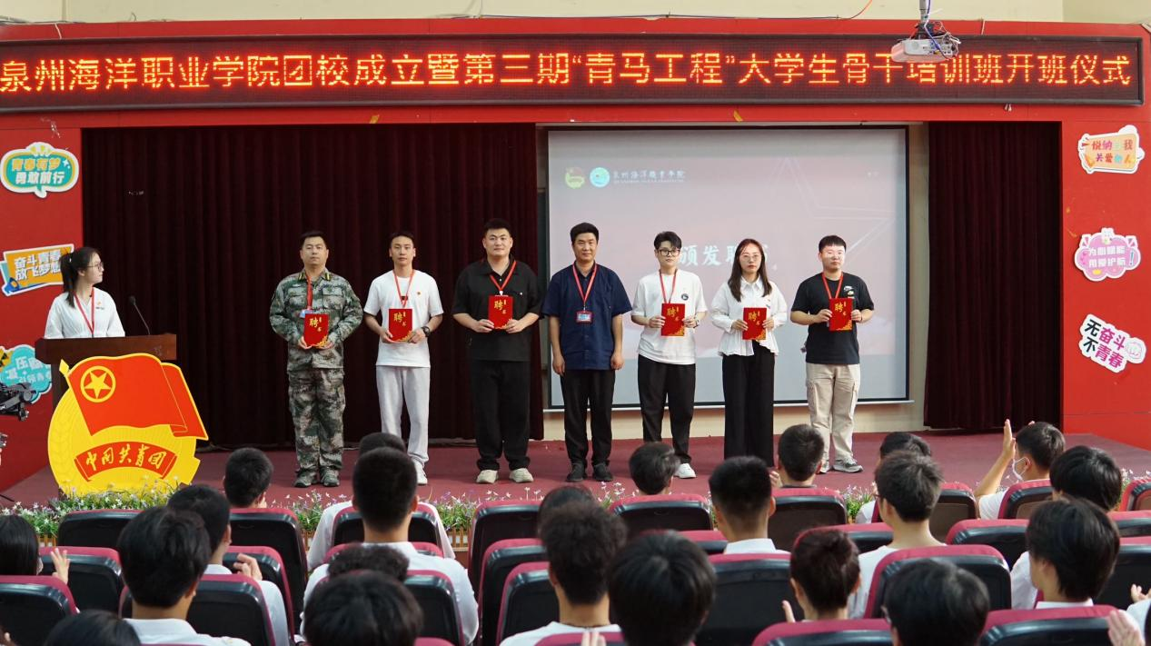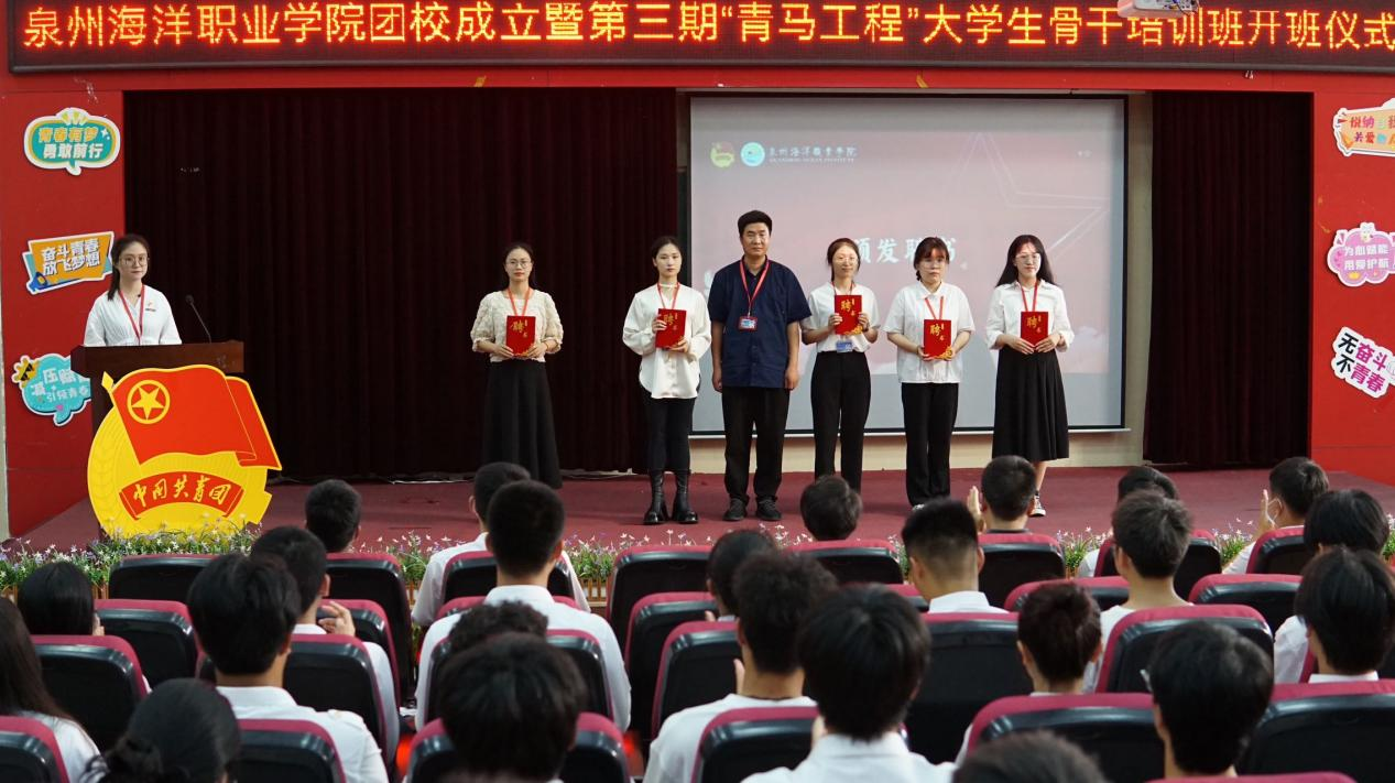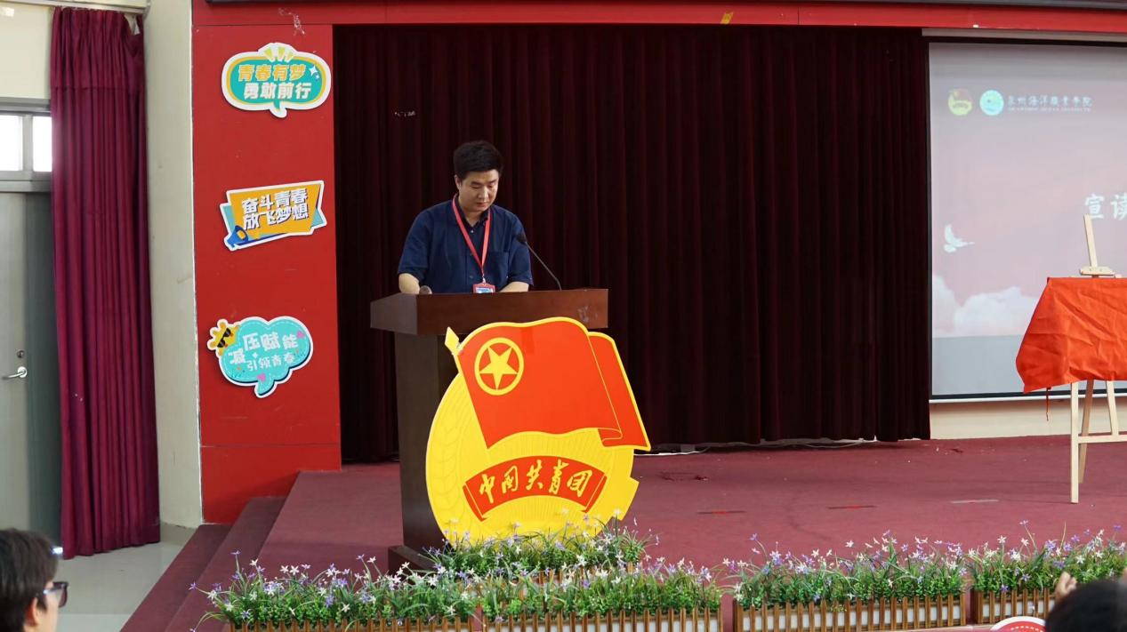 学工部部长张君宣读《关于同意成立泉州海洋职业学院团校的批复》《关于聘任蔡岱宏、杨艺云等13名同志为泉州海洋职业学院团校讲师的决定》。