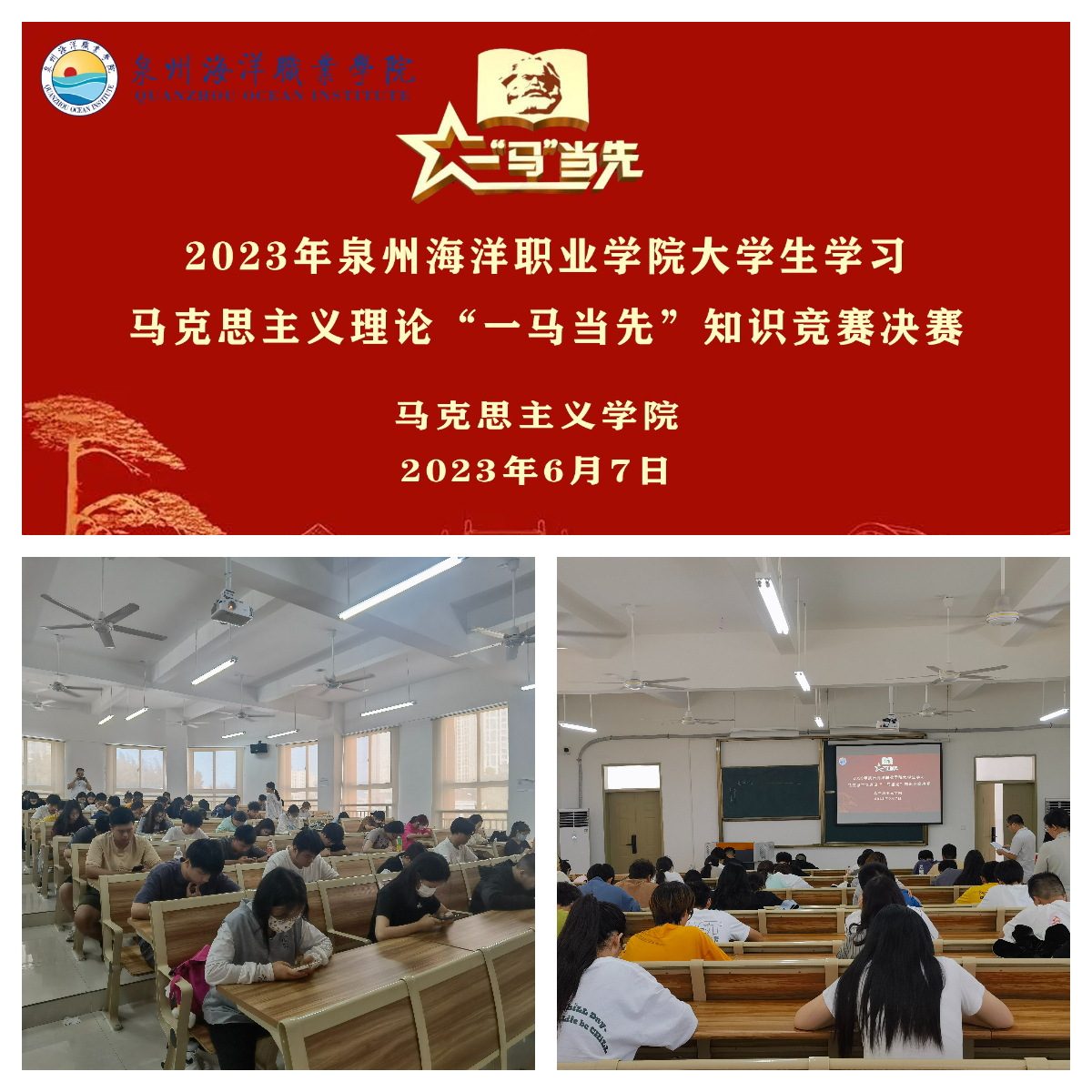 我校以“一‘马’当先”知识竞赛活动为载体,深入实施大学生马克思主义自主学习行动计划,引导当代青年学生增强“四个自信”,学懂弄通习近平新时代中国特色社会主义思想,认真品读马克思主义理论、党史和党的二十大精神,扎实提升马克思主义理论素养,用竞赛传递青春力量,努力营造学习马克思主义理论的良好氛围,为参加第八季省高校大学生学习马克思主义理论“一‘马’当先”知识竞赛做好充分准备。