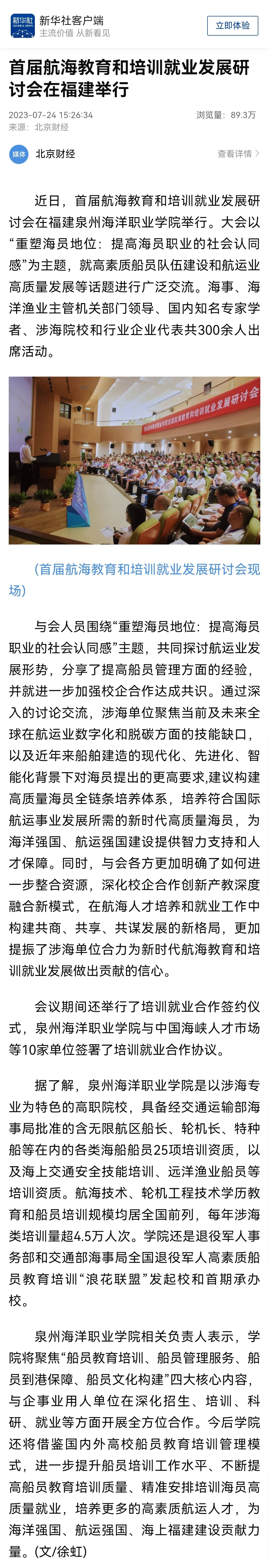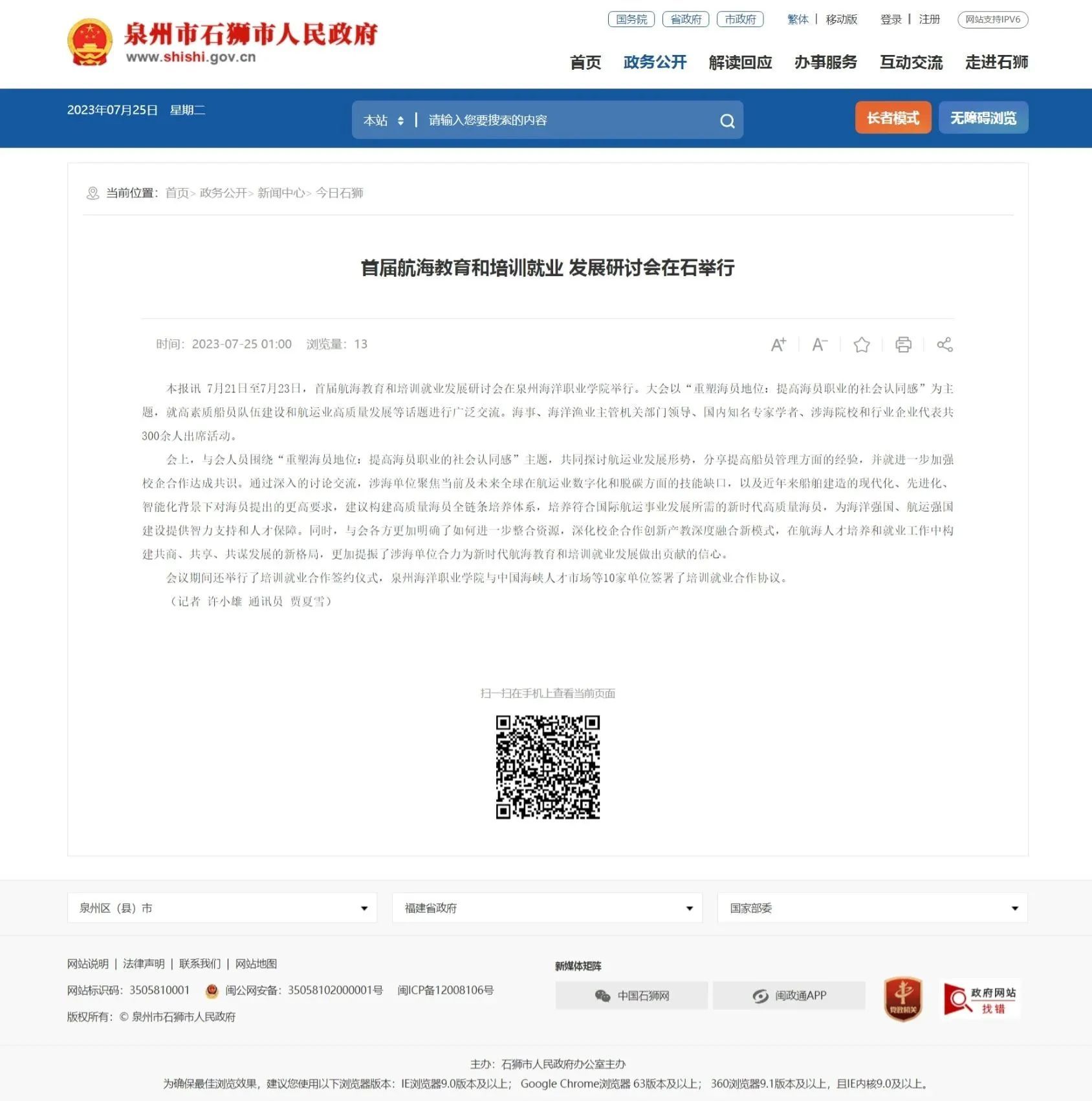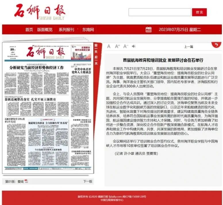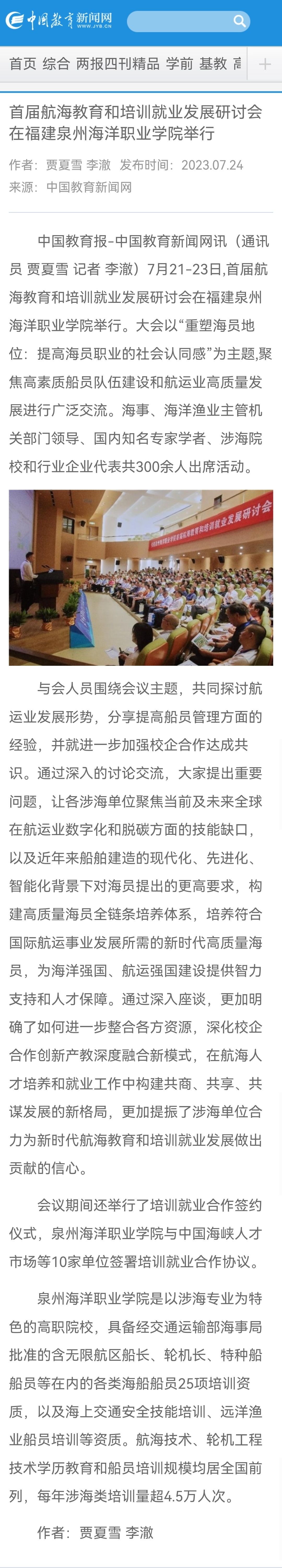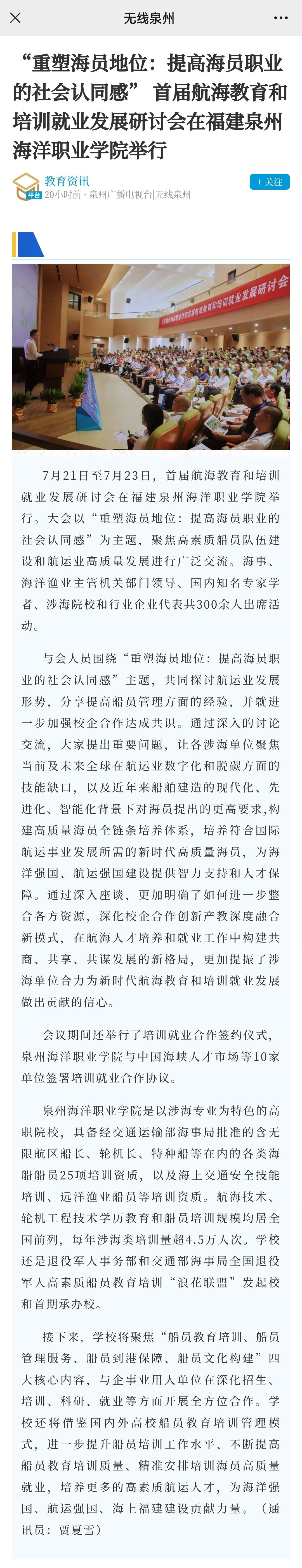 (新闻中心讯 党委宣传部供稿 校党委宣传部报道)近日,新华社、中国教育报、中国教育新闻网、福建省教育厅官方网站、福建日报社新福建客户端、泉州晚报、泉州电视台无线泉州客户端、石狮市人民政府官方网站、石狮日报、菲律宾联合日报等多家知名媒体,对泉州海洋职业学院主办“重塑海员地位:提高海员职业的社会认同感”航海教育和培训就业发展研讨会一事进行了报道。