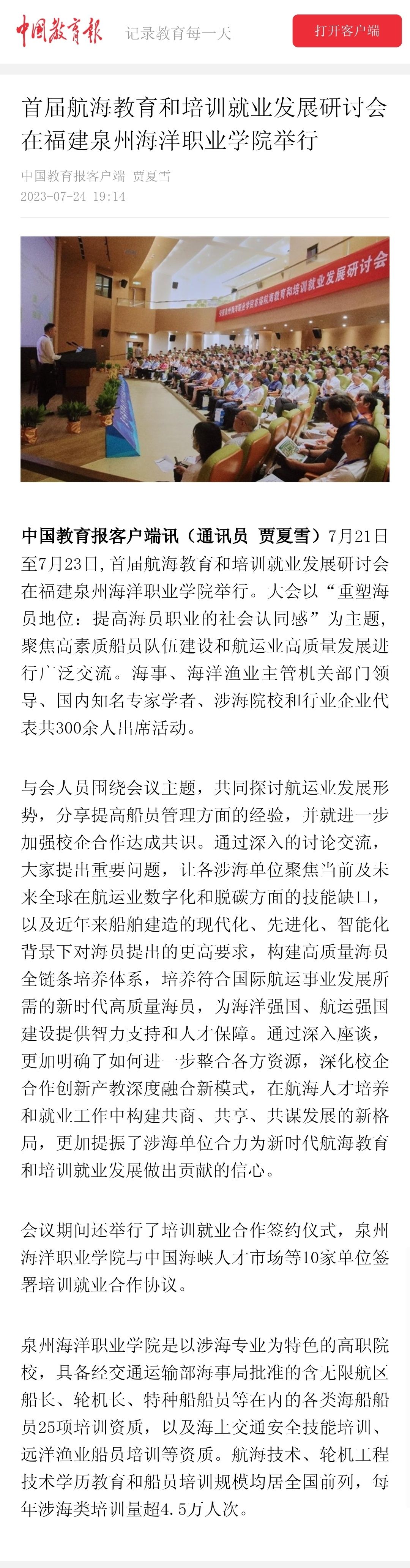 报道提到,与会各方围绕“重塑海员地位:提高海员职业的社会认同感”主题,共同探讨航运业发展形势,分享了提高船员管理方面的经验,并就进一步加强校企合作达成共识,明确了如何进一步整合资源,深化校企合作创新产教深度融合新模式,在航海人才培养和就业工作中构建共商、共享、共谋发展的新格局,更加提振了涉海单位合力为新时代航海教育和培训就业发展做出贡献的信心。