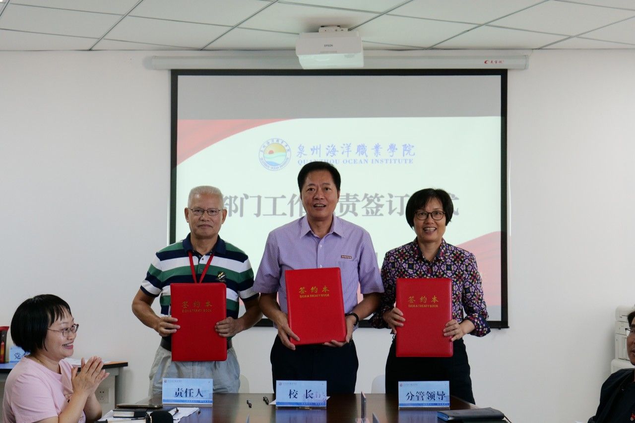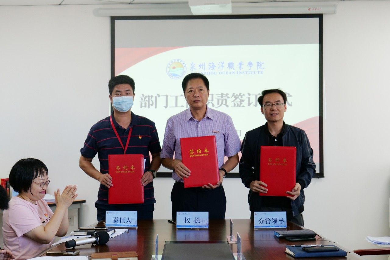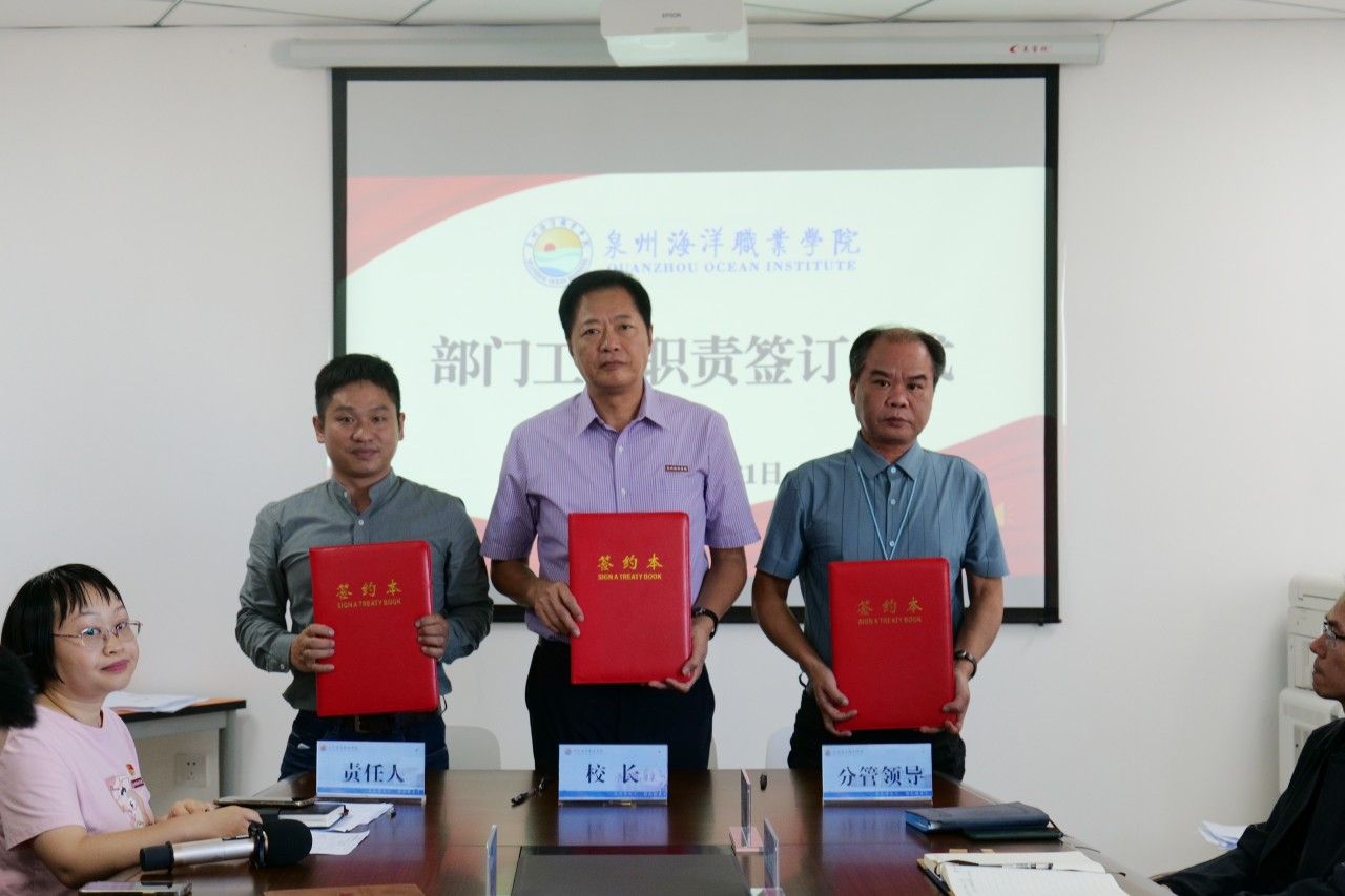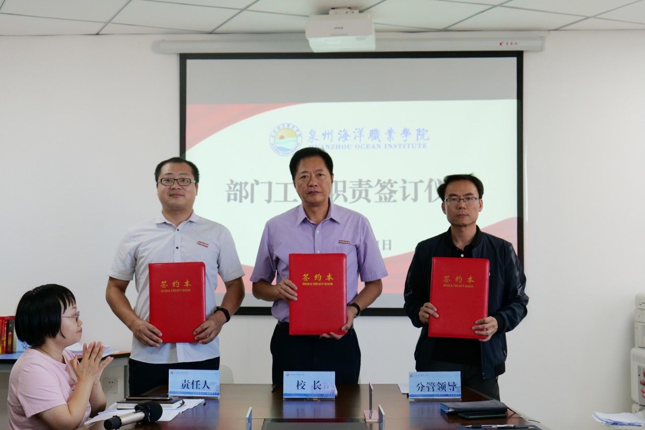 随后,校长庄伟廉、党委书记郑艳分别代表学校行政、党委与分管校领导、各行政部门和二级学院负责人签订《部门工作职责》。