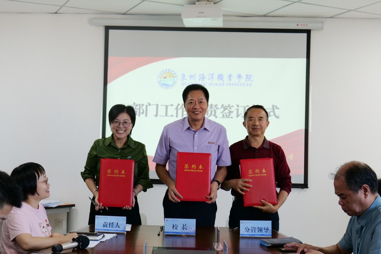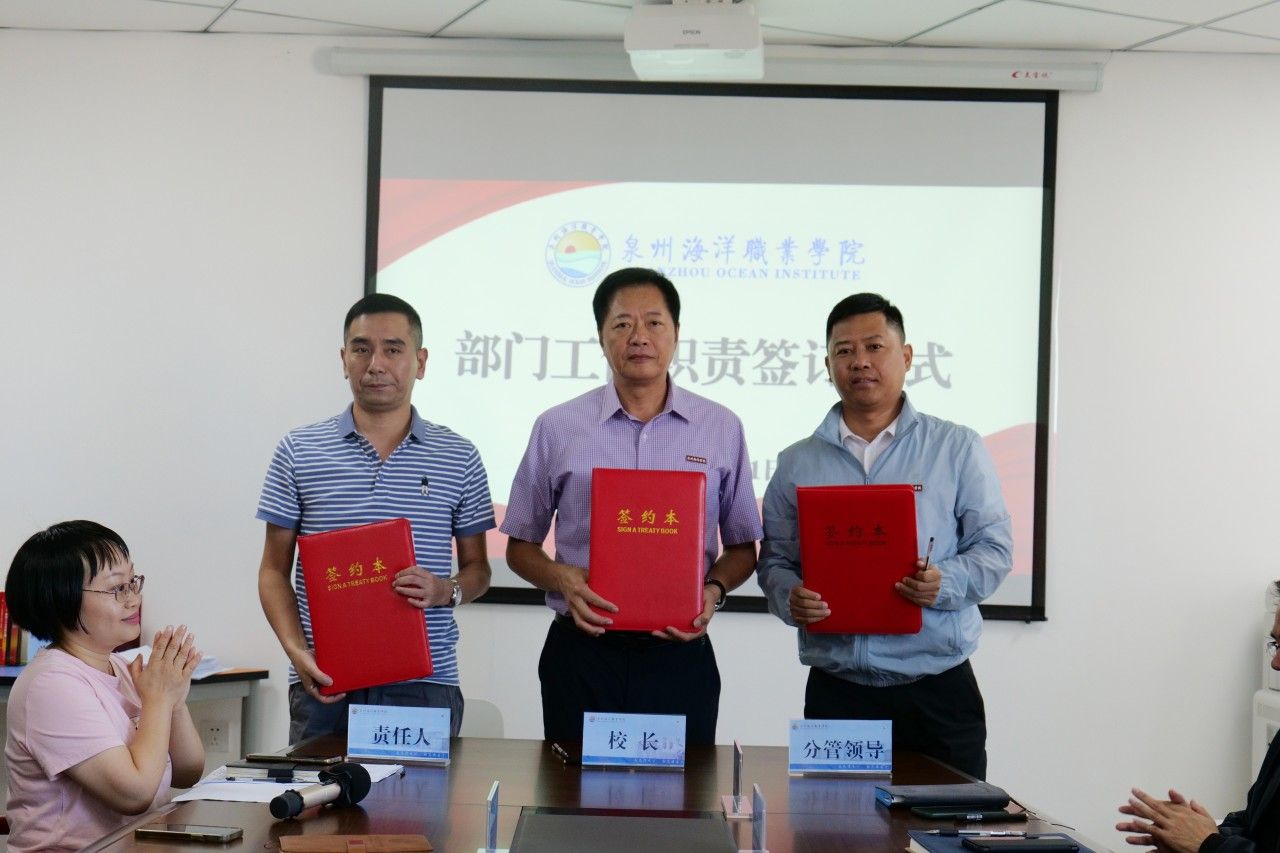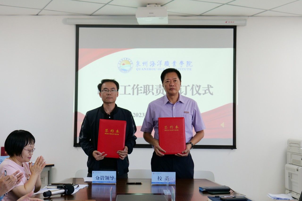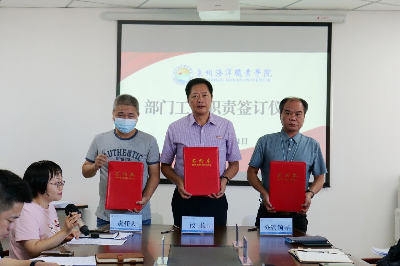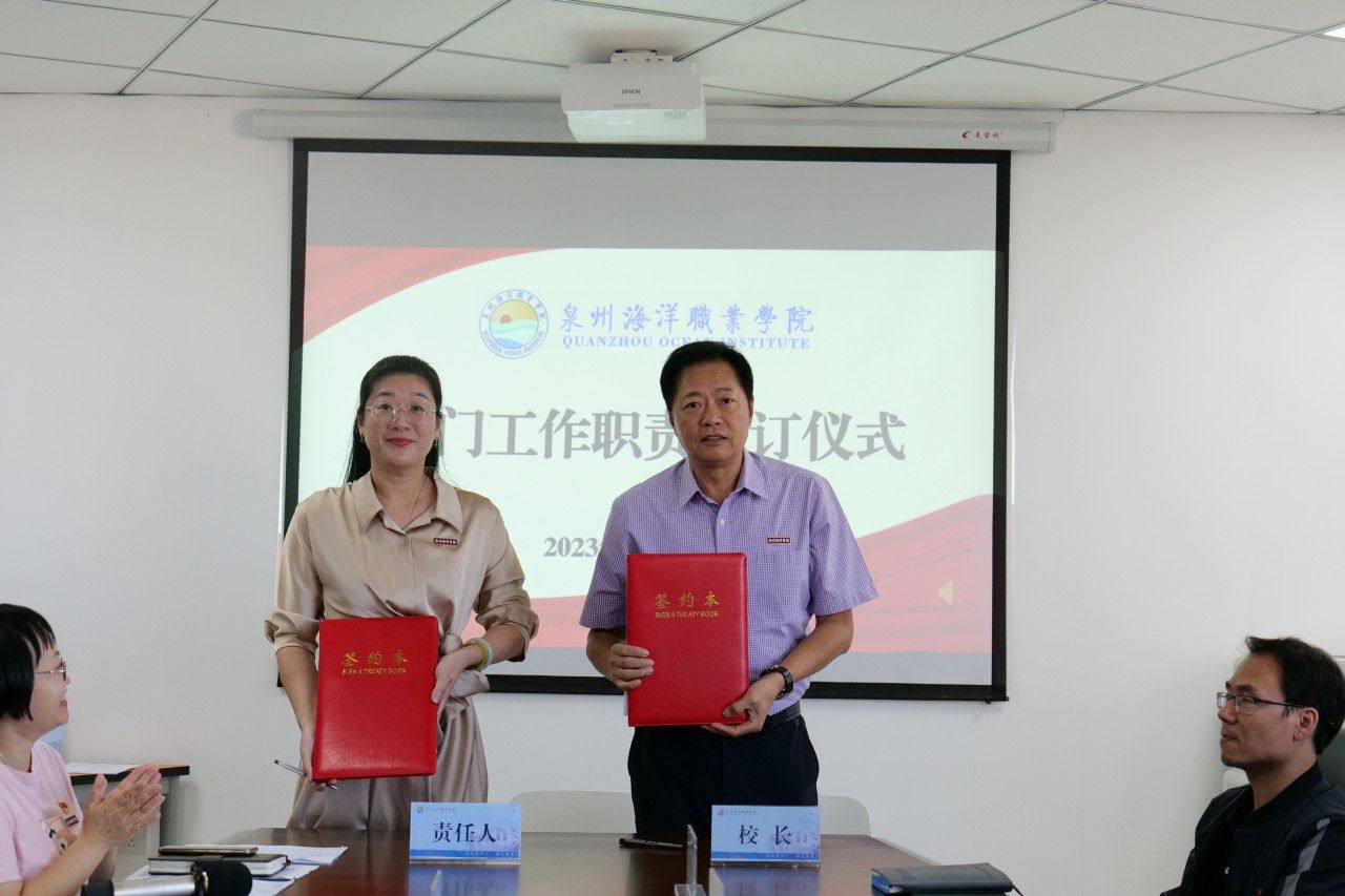 随后,校长庄伟廉、党委书记郑艳分别代表学校行政、党委与分管校领导、各行政部门和二级学院负责人签订《部门工作职责》。