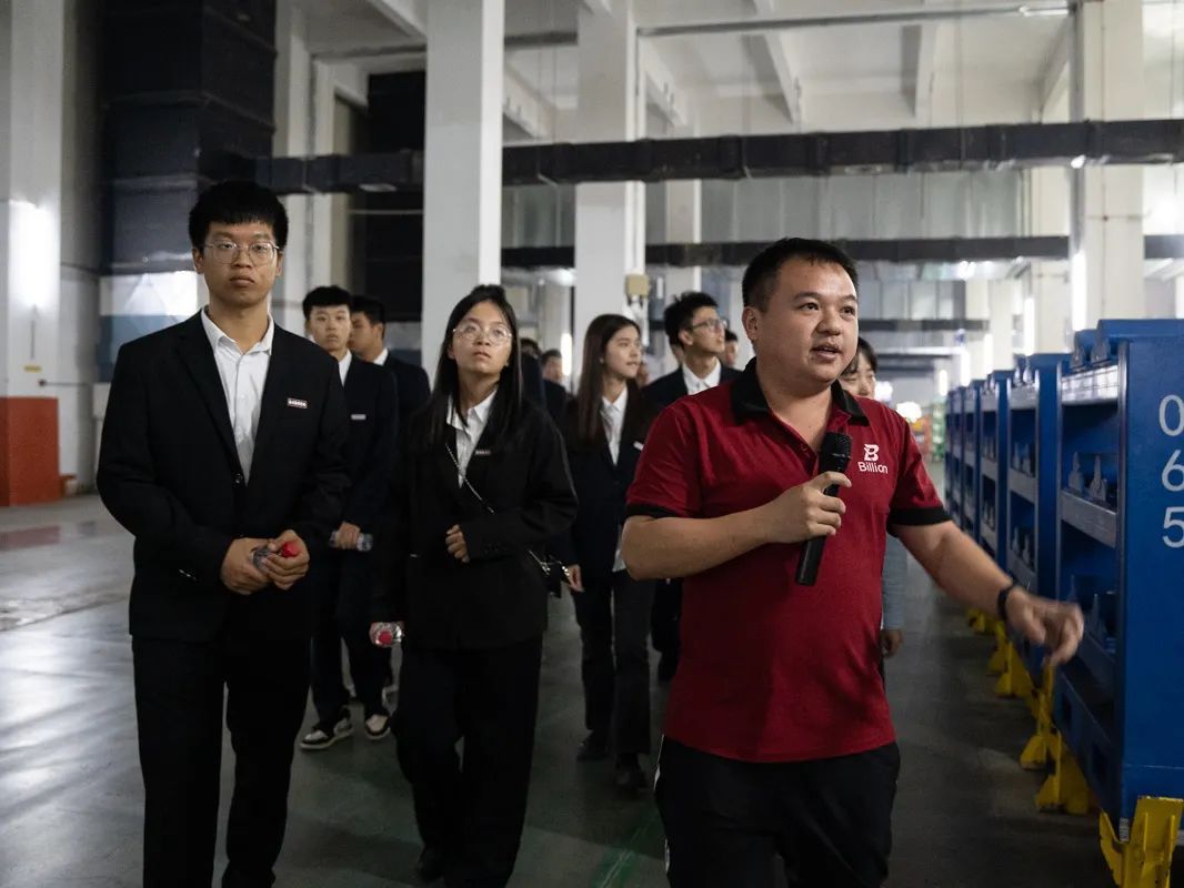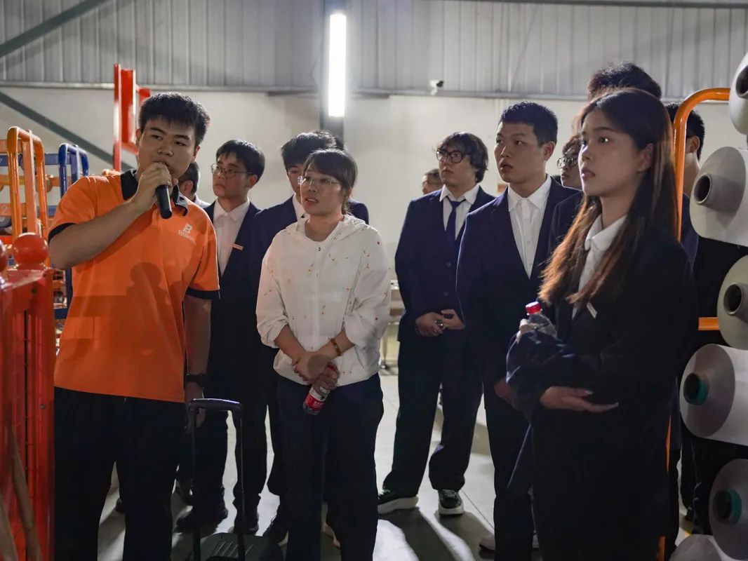 第二站,来到福建百宏聚纤科技实业有限公司,在人力资源经理郭安妮的带领下,师生们参观了5G智能车间。在这个车间里,全智能化的流水线生产模式和一系列自动化操作的机器人引起了师生们的极大关注。