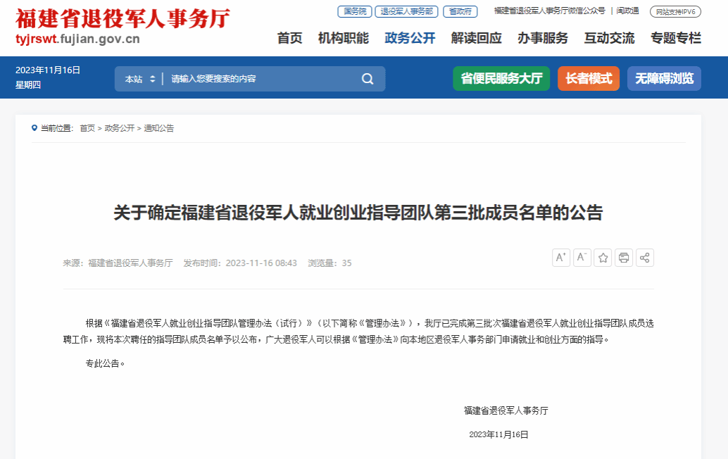 (新闻中心讯 对外合作部洪曼玲供稿 校党委宣传部报道)11月16日,福建省退役军人事务厅已完成第三批次福建省退役军人就业创业指导团队成员选聘工作。经个人申请,有关单位遴选推荐,省厅复核,结果公示等程序,我校海洋工程学院书记兼三创学院副院长周甜、经济管理学院副院长黄金帅、三创学院办公室主任郑天明三位教师入选第三批福建省退役军人就业创业指导团队成员名单。