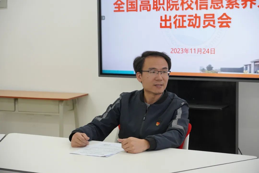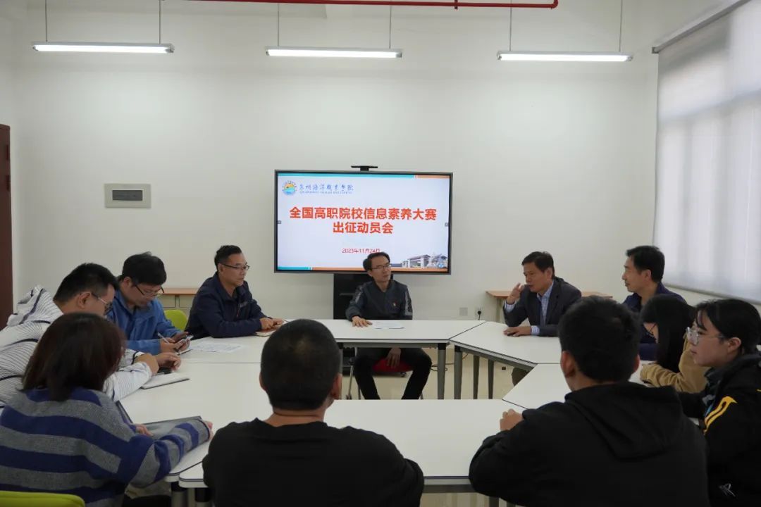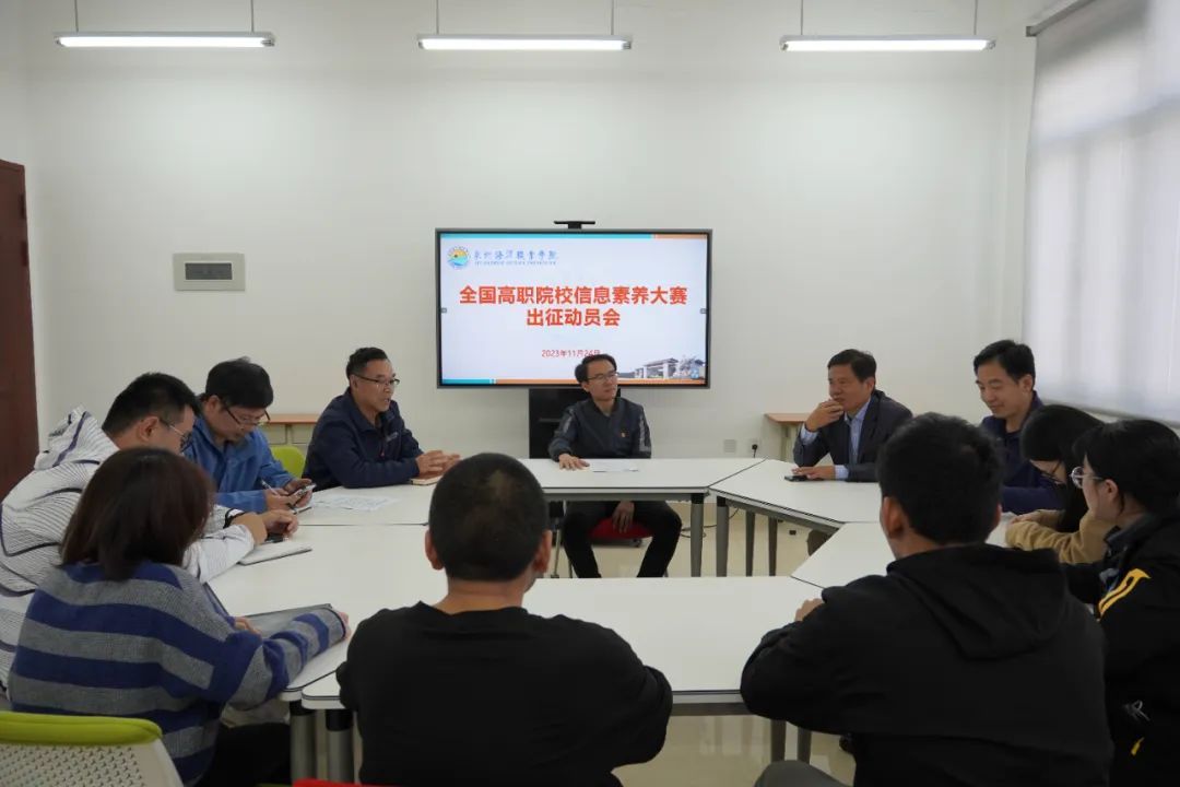 为积极备战2023年全国高职院校信息素养大赛国赛,提振师生备赛信心,11月24日上午11时,我校在图书馆二楼研讨室召开“全国高职院校信息素养大赛出征动员会”。学校李明灿副校长亲临会场,作出征国赛动员讲话:首先对黄剑辉、潘越两名同学取得的突破性成绩、能晋级国赛表示祝贺,并对参与备赛的图书馆指导老师表示感谢;希望两名同学放下包袱,以一种轻松、自由的心态,博取更好的成绩,实现自我超越;同时,图书馆要以此为契机,加强广大学生的信息素养教育,提升学校学生信息素养的整体水平;希望教师群体也要积极参加信息素大赛微课赛,并争取实现突破,为学生做好榜样。参赛学生所在单位,经管学院张恒中院长作了赛前指导,希望两名同学树立信心、保持平常心,在已经取得优异成绩的基础上,实现新的突破。