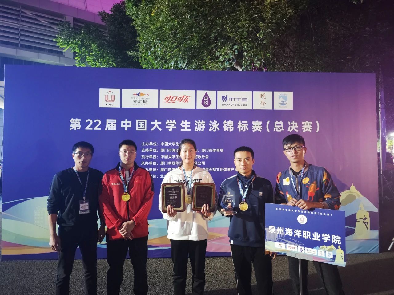 (新闻中心讯 党委宣传部供稿 校党委宣传部报道)12月6日,第22届中国大学生游泳锦标赛(总决赛)在厦门落下帷幕。我校游泳队在艺术体育学院院长孙玉坤和教师蔡清泽的带领下,取得了四金二铜的好成绩,并获得了乙组团体总分第三名,同时打破了两项赛会纪录,为学校赢得了荣誉。