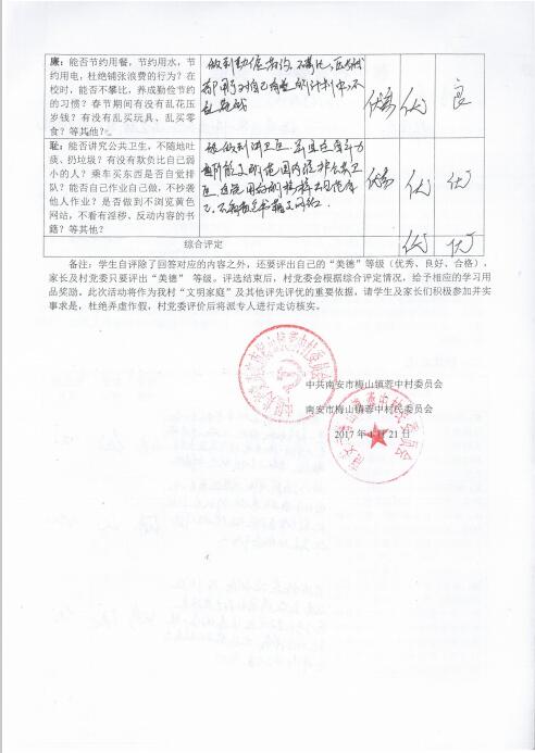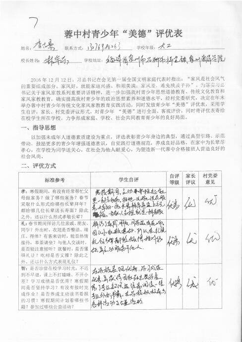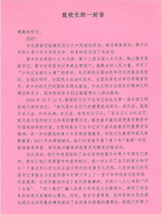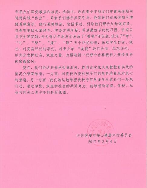 (党政办 李明灿 编辑)近日,全国文明村、全国民主法治示范村、全国扶贫先进单位——泉州南安市蓉中村致信学院林华东院长,向院长介绍该村在2017年寒假期间开展的青少年“美德”评优、家庭教育讲座、家风家训教育讲座等教育实践活动,并附上来自该村的我院15级社体专业李志景同学的美德评优表,蓉中村还在信中对学院的教育培养表示了感谢,并希望学校、家庭和社会能共同努力,帮助青少年更好的成长。