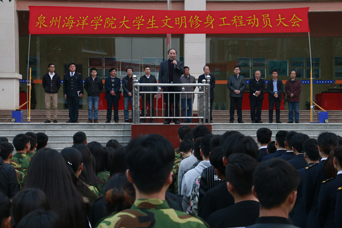 (记者团供稿 党政办编辑)2017年3月1日18时,泉州海洋学院文明修身动员大会在我院国旗台前举行。学院党政领导、各部门负责人以及15.16级全体学生参加动员大会。会议由副院长、学生处处长赵山辉主持,林华东院长作动员讲话。