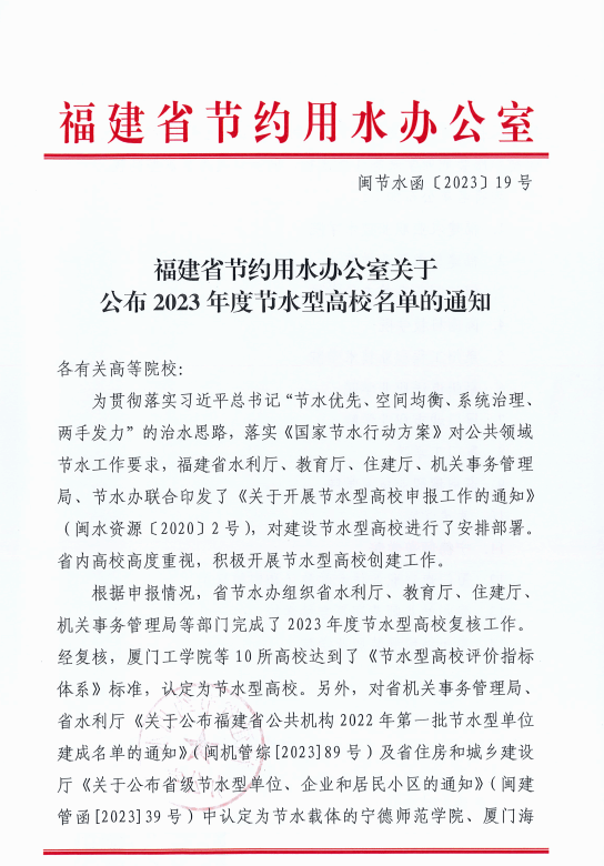 (新闻中心讯 后勤处供稿 校党委宣传部报道)日前,福建省节约用水办公室公布了2023年度省级节水型高校名单(闽节水函[2023]19号文)。泉州海洋职业学院经福建省节水办组织省水利厅、教育厅、住建厅、机关事务管理局等部门的联合复核评审,达到了《节水型高校评价指标体系》标准,被认定为节水型高校。