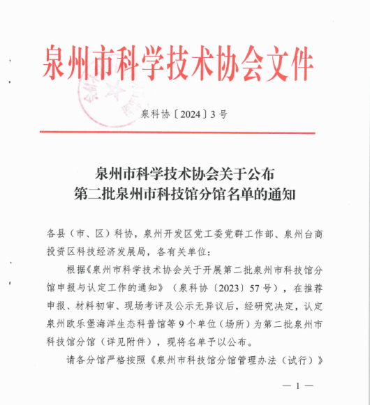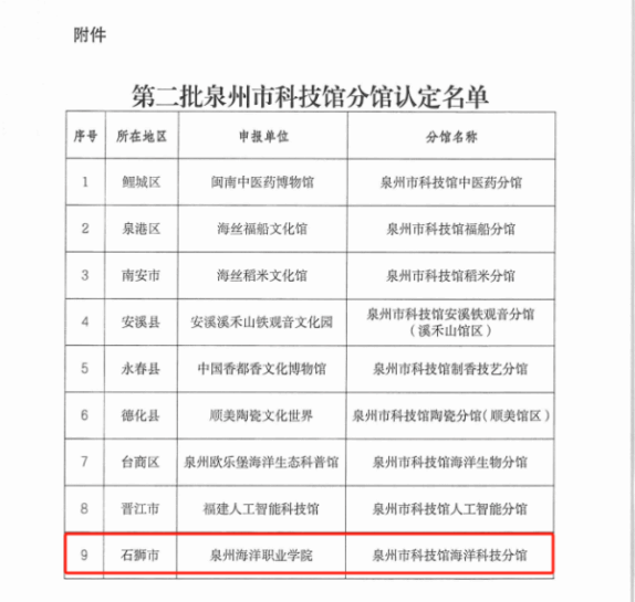 2024年1月3日,泉州市科学技术协会发布了《关于公布第二批泉州市科技馆分馆名单的通知》(泉科协〔2024〕3号),认定我校申报的泉州市科技馆海洋科技分馆为第二批泉州市科技馆分馆。