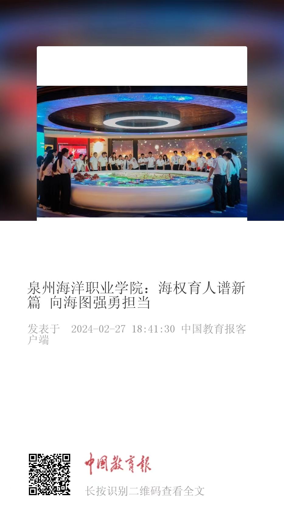 春风化雨,立德树人。学校将积极推进海权党建思政馆和涉海专业人才培养的融合、海权党建思政馆和思政课教学融合,组织师生开展形式多样、内容丰富的思政教育实践活动,将海权党建思政馆打造成开展思政教育的理论滋养平台,成为思政教育融入社会大课堂的实践探索平台,着力破解思想政治理论课教学实践难、入脑入心难等痛点堵点问题,积极推进思政课教学改革创新,努力办好新时代的“大思政课”。泉州海洋职业学院将带领全体教职员工,致力于构建一流的海洋教育实践和研究体系,加强全民海洋意识教育,提升国民海洋素养,坚定海洋文化自信自强,为海洋强国建设贡献力量。(蔡永鸿)