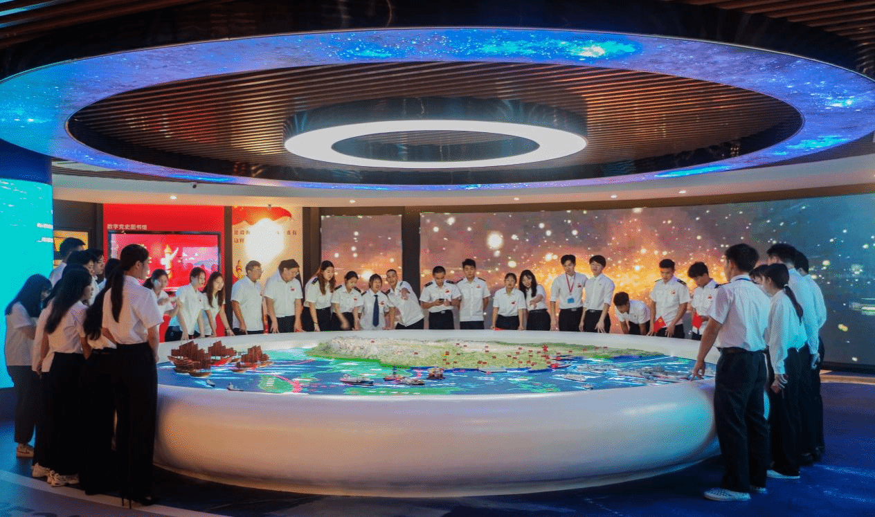 更多向海而兴的实践正在展开,更多海洋梦想正在实现。海权党建思政馆内设的“大思政”VR实训室,运用全息投影、虚拟现实技术,海权红馆在展馆的中央设直径8米的圆形电子沙盘,重点展示我国近三百万平方公里蓝色国土的壮阔景象,特别展示我国南海九段线、以及出海口岛链、钓鱼岛、台湾等主要岛屿。用历史的视角贯通过去、现在和未来,LED沙盘上郑和下西洋船队、“山东号”航母舰队和最先进的国产商船、海上特种设备等模型,跨越时空,让古代海上丝绸之路和现代海洋强国之路交相呼应。