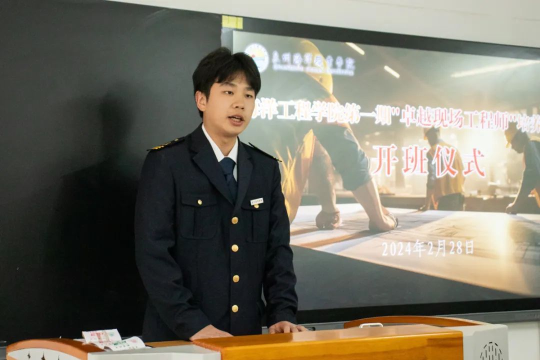 出席本次开班仪式的领导有中泉集团船务分公司副总经理庄文显、招聘部经理陈志山,厦门泛海国际船舶管理有限公司经理陈宾鸿、高级轮机长吴茂山,泉州海洋职业学院副校长刘锦辉、黄瑞梅,教务处处长蔡小莲,航海交通学院院长董远志、党支部副书记董灿荣,海洋工程学院院长陈景锋、党支部书记周甜、副院长林杰民。海洋工程学院党支部副书记俞建梁主持仪式。
