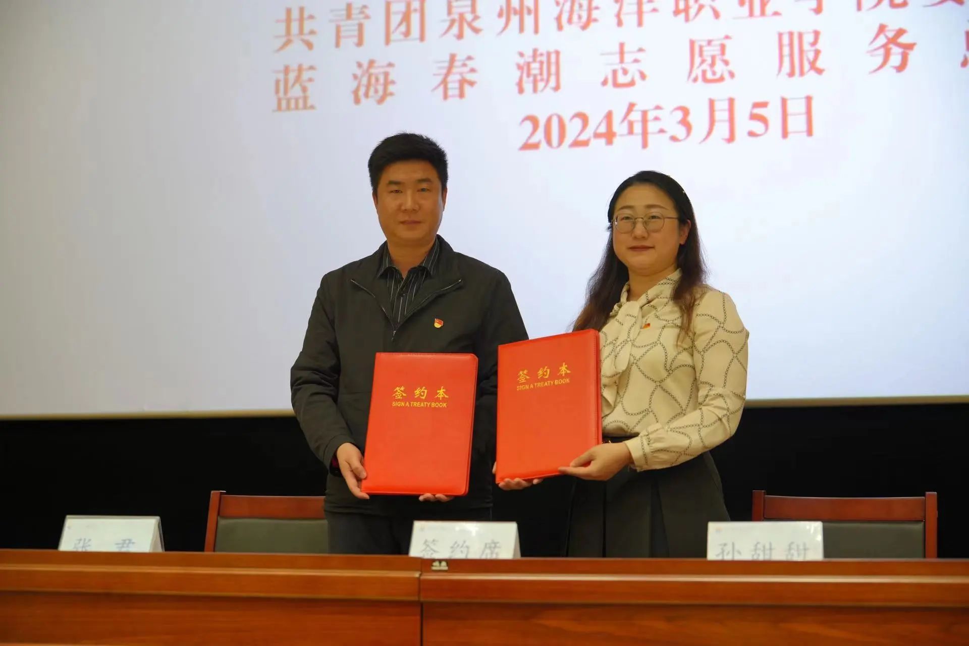 石狮市团市委书记孙甜甜、学工部部长张君签订了大学生社区计划“团团志愿”项目合作备忘录。