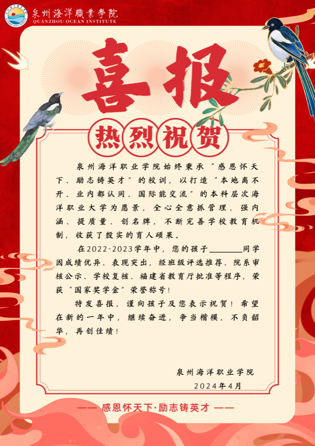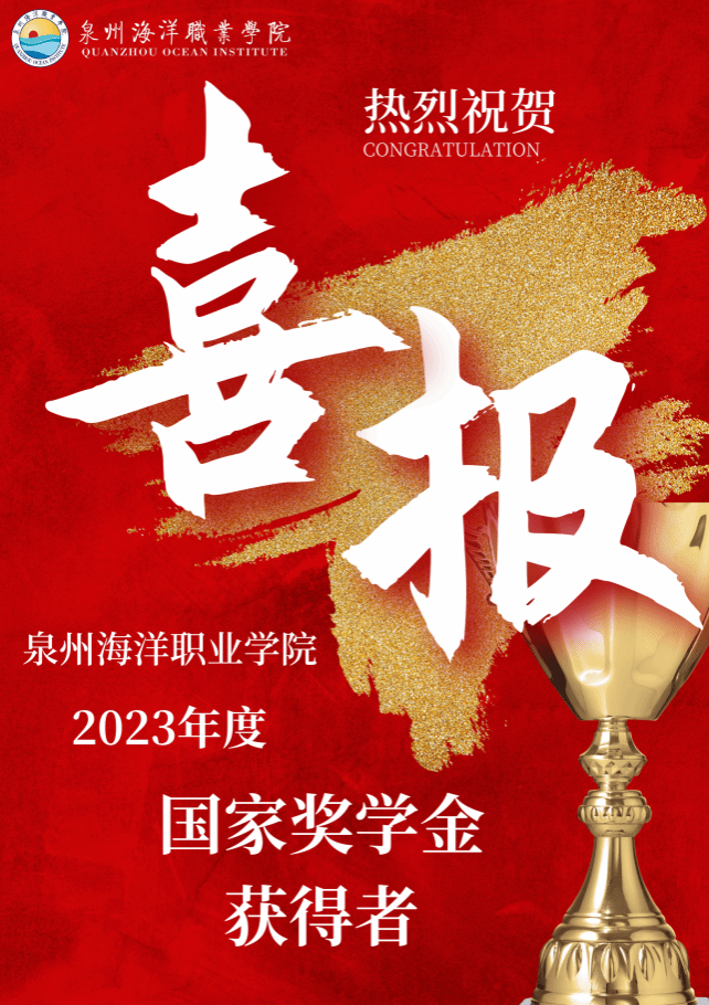 一份喜报,一份收获。2023年9月我校修订颁发了《泉州海洋职业学院国家奖学金励志奖学金评定办法》([2023]322号)。严格按照上级相关文件指示精神,经班级评选、学院推优、校级联评确定8位国家奖学金获得者,86名国家励志奖学金获得者推荐人选。而喜报的传递,也是一种社会价值的体现,它告诉我们泉海的学子,个人的努力和付出得到集体的认可和肯定,进一步激发了我校学子的奋斗精神和进取心。