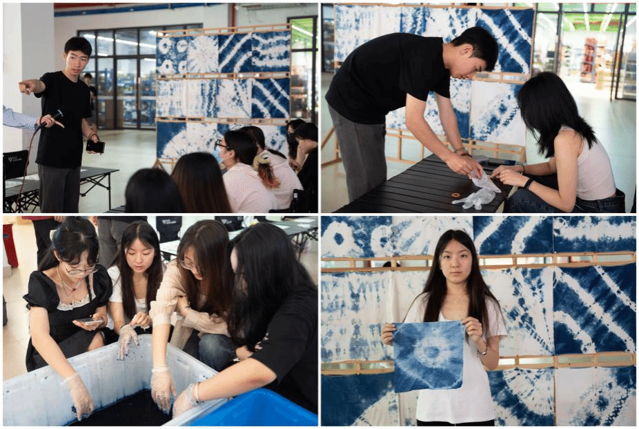 扎染由于捆扎受力不同、方法不同、侵染程度不同而产生深浅虚实、变幻多端的色晕图案。现场体验的同学们通过打结扎法、线绑扎法等,经过叠、扎、浸、晾,每个人手中的白布变得蓝白幽韵。同学们纷纷展示自己的作品,一起分享动手扎染的体会和收获的喜悦,现场气氛热烈融洽。
