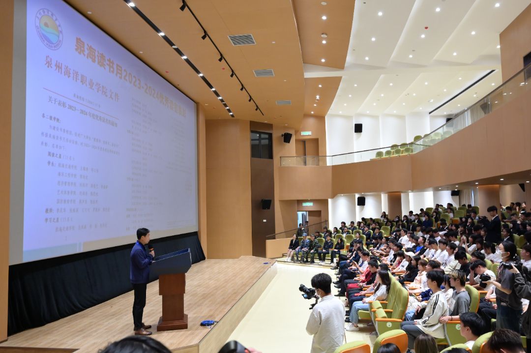 4月24日,由图书馆主办的泉海读书月2023-2024优秀读者表彰颁奖典礼在图书馆二楼报告厅隆重举行。校长庄伟廉,副校长黄瑞梅,校党委副书记、副校长李明灿,教务处处长蔡小莲,学生处副处长、校团委书记屈先锋,通识教育学院院长梁小华莅临活动现场。各二级学院副书记,图书馆全体成员,图书馆学生工作委员会委员和学生代表等200余人共同参加活动。本次活动由图书馆馆长张向辉主持。