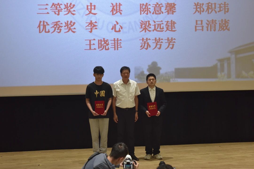 ▲庄伟廉校长为获省赛一等奖的黄剑辉同学、省赛三等奖的潘越同学颁奖