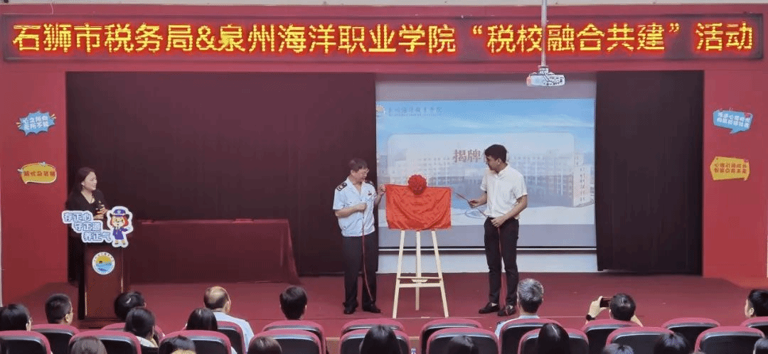 石狮市税务局副局长张国欣和泉州海洋职业学院副校长陈永鑫共同为“税校融合共建基地”揭牌。